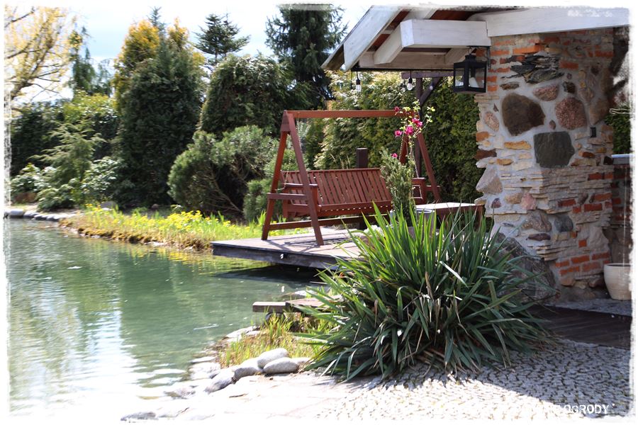 Rzecz najbardziej efektowna, która bez wątpienia stanowi wizytówkę tego ogrodu, to duży staw kąpielowy, na moje oko mający około 200 – 300 metrów kwadratowych. Zresztą jak twierdzi Piotr, ogród bez wody, to nie ogród. Choćbym nie chciał, muszę się zgodzić z tym stwierdzeniem.