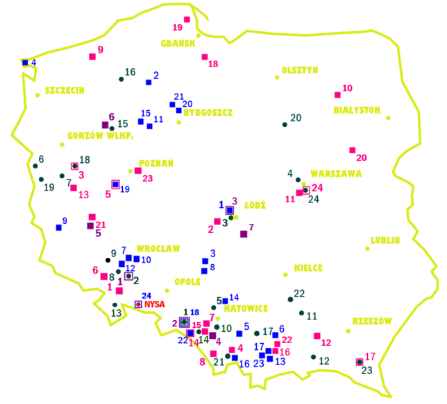niebieskie kwadraty z numerami od 1 do 24, które obrazują wszystkie ogrody odwiedzone w sezonie 2 – 2019