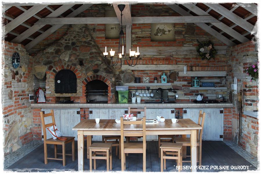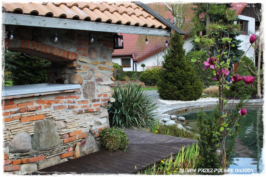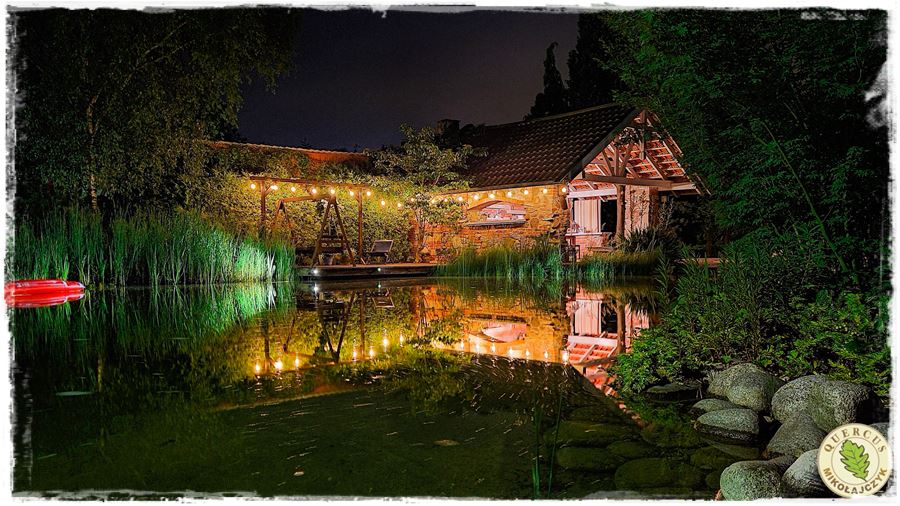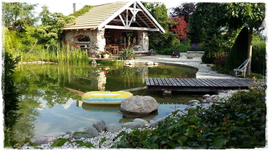 Ze stawem idealnie komponuje się zlokalizowana na jego brzegu duża budowla, którą śmiało można nazwać domkiem, kuchnią letnią i altaną w jednym.