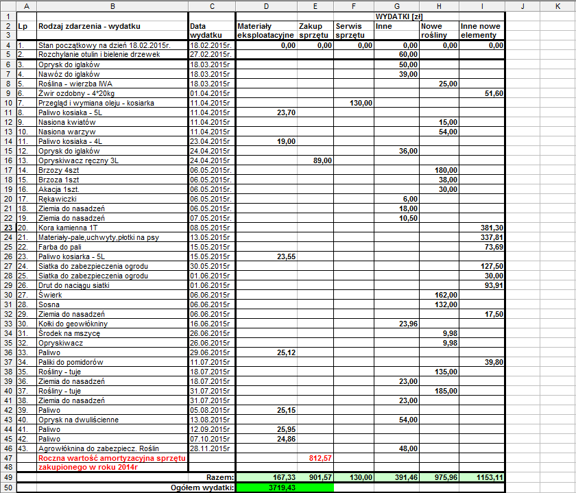 - Zakup sprzętu – 901,57zł (w tym 812,57 amortyzacja roczna sprzętu zakupionego w roku 2014)