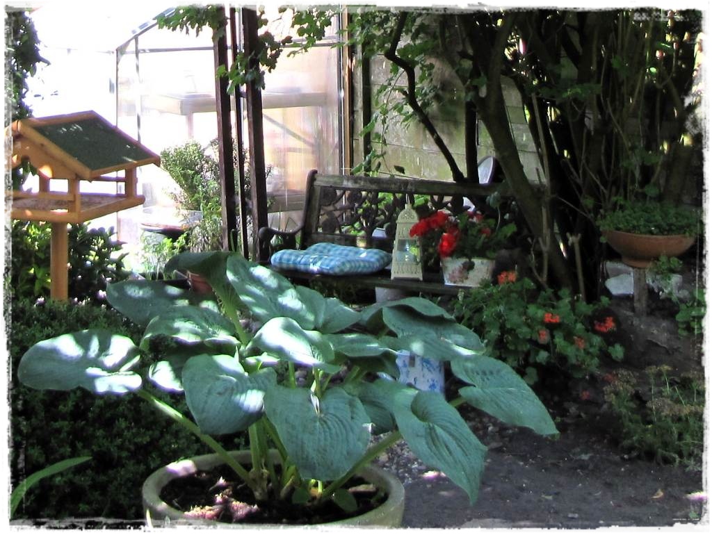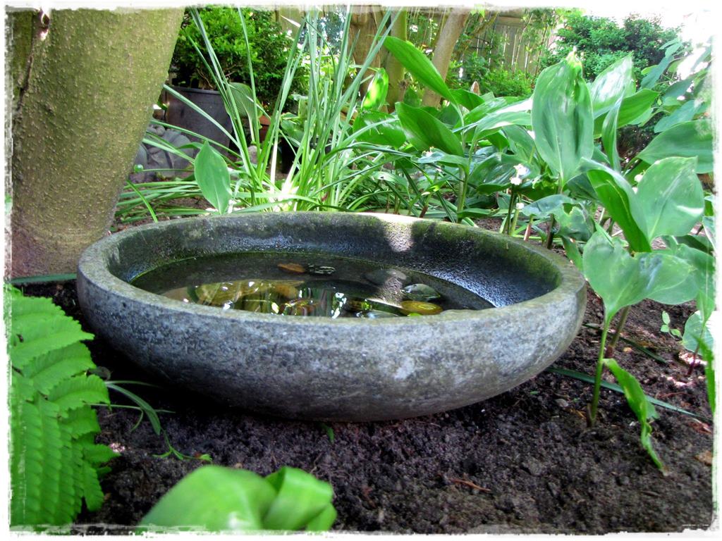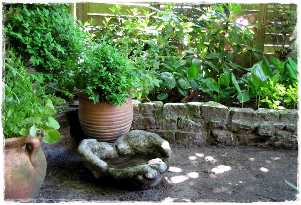 W zamian za zlikwidowane oczko, mam pod magnolią taki maleńki zbiorniczek.. rosną tam hosty, niezapominajki kaukaskie, kaczeńce, a w maju roznosi się zapach konwalii. Lubię tam siadać i słuchać odgłosu wody. A pobliskie żaby już się dowiedziały i mnie odwiedzają.