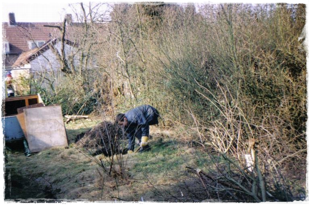 Dla porównania: jak wyglądał mój ogródek 19 lat temu. Trawa po kolana, tak samo głęboko korzenie, nie było widać tarasiku, na pół ogródka dzikie drzewka i krzaczory…. Syn mi dużo pomógł. Przychodził ze szkoły i kopał….”