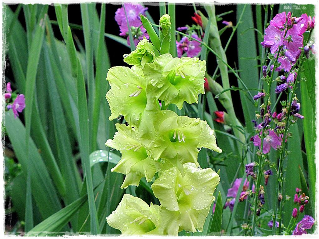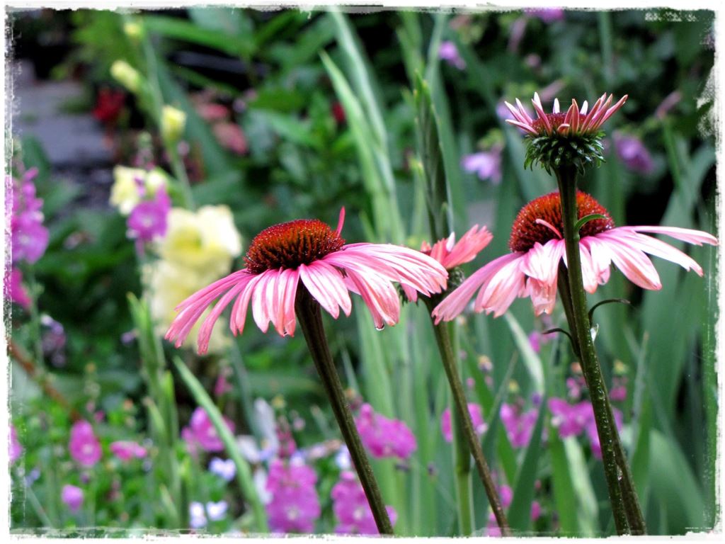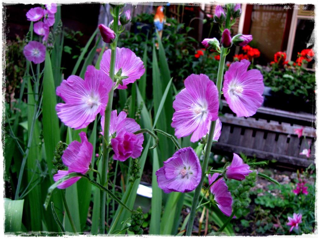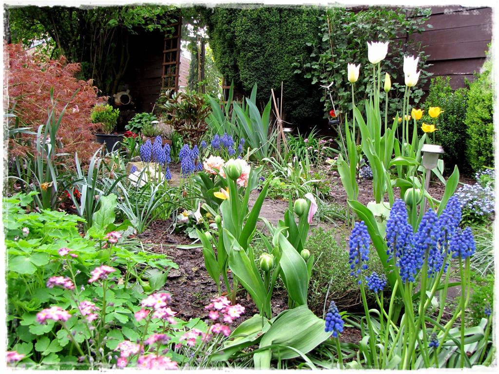 W pierwszej części ogródka do niedawna było oczko wodne, które zostało zlikwidowane i trzeba było zagospodarować to miejsce. Wiosna królują tu wszelkie cebulowe… tulipany, narcyzy, szafirki… wcześniej krokusy i przebiśniegi, później stokrotki, orliki, niezapominajki…. Latem przystraja się w kwiaty ślaz, który przyciąga wiele pszczół. Kwitną lewkonie, dalie, jeden mały krzaczek lawendy… jeżówki i zaczęły mieczyki.