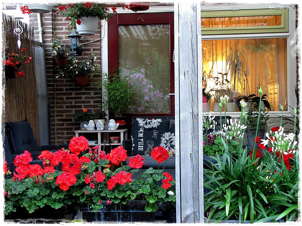 Nie zapominam o tarasie. Jest zadaszony więc nawet gdy pada, mogę siedzieć. Na tarasie dominuje czerwień… stojące i wiszące pelargonie, begonie… mam tez w dużych donicach białe agapanty. Na półeczce pod oknem stoją moje ulubione fuksje, w doniczkach własnoręcznie malowanych.