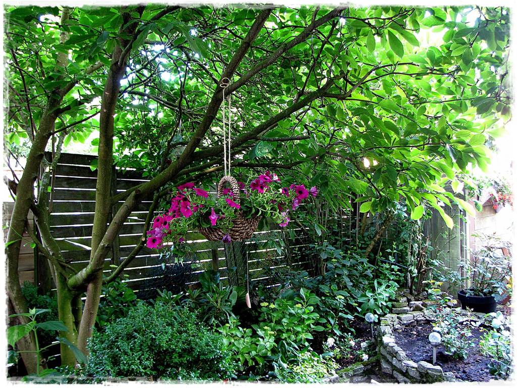 „Właściwie ogród to za duże słowo. Jest to przydomowy ogródek, jakich można spotkać wiele przy domkach szeregowych. Ogródek całkiem normalny [z tym akurat próbowałbym dyskutować 😉 ]. Zajmuję się nim 19 lat. Zmieniał się co jakiś czas. Z pierwszych lat pozostały 2 magnolie i kalina, które tak się rozrosły, że tworzą w tej chwili słoneczny parasol na upalne dni.