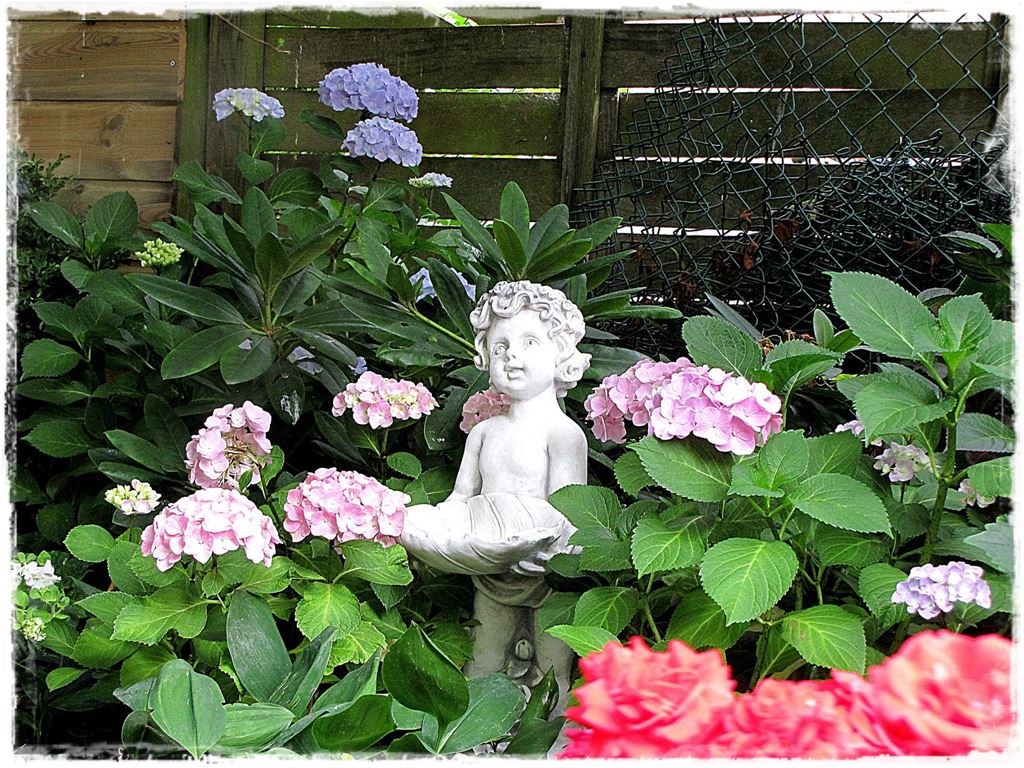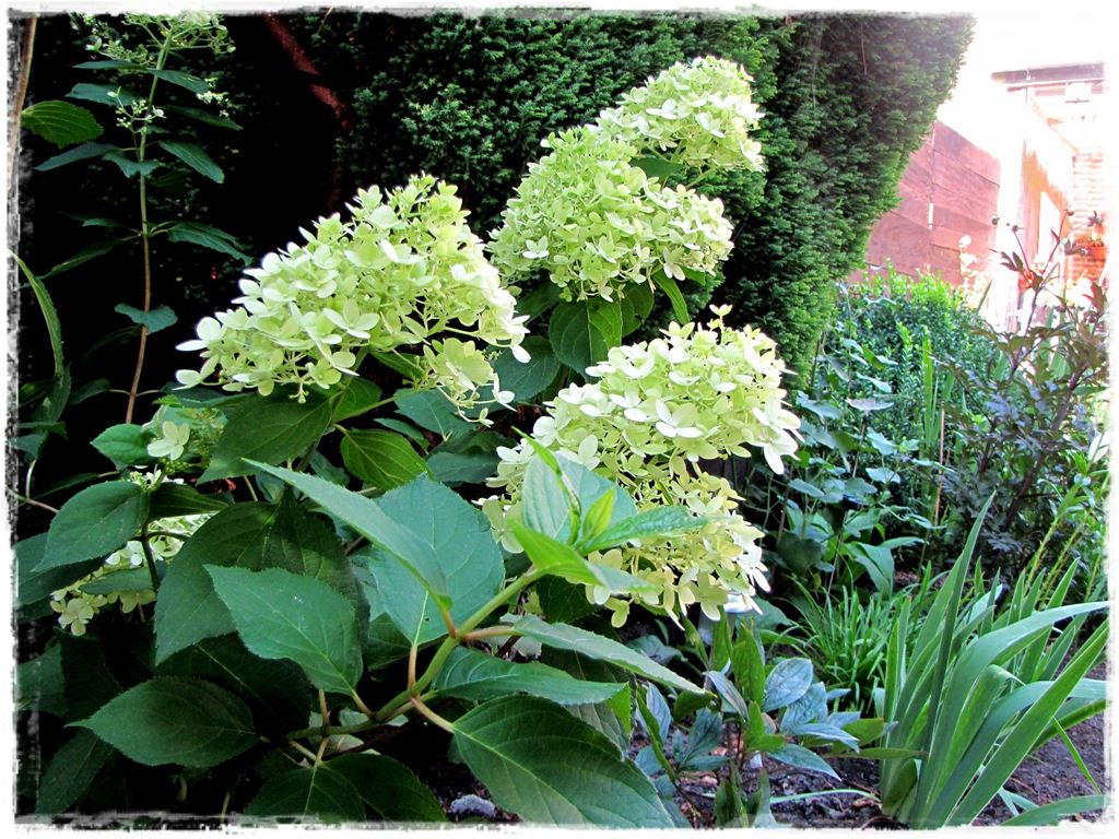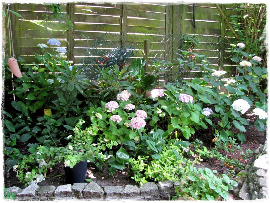 Urządziłam tez lustrzany zakątek… Pomysł chodził mi po głowie od dawna i w tym roku go zrealizowałam. Wiosną kwitną tam 2 ciemierniki. Latem hortensja bukietowa, a po bokach biała passiflora i clematis. Kolo aniołków liliowce. Na przeciwko hosty… Również młode. Wcześniej rósł tam bukszpan, ale już od dawna chorował, wiec czas było go wykopać.