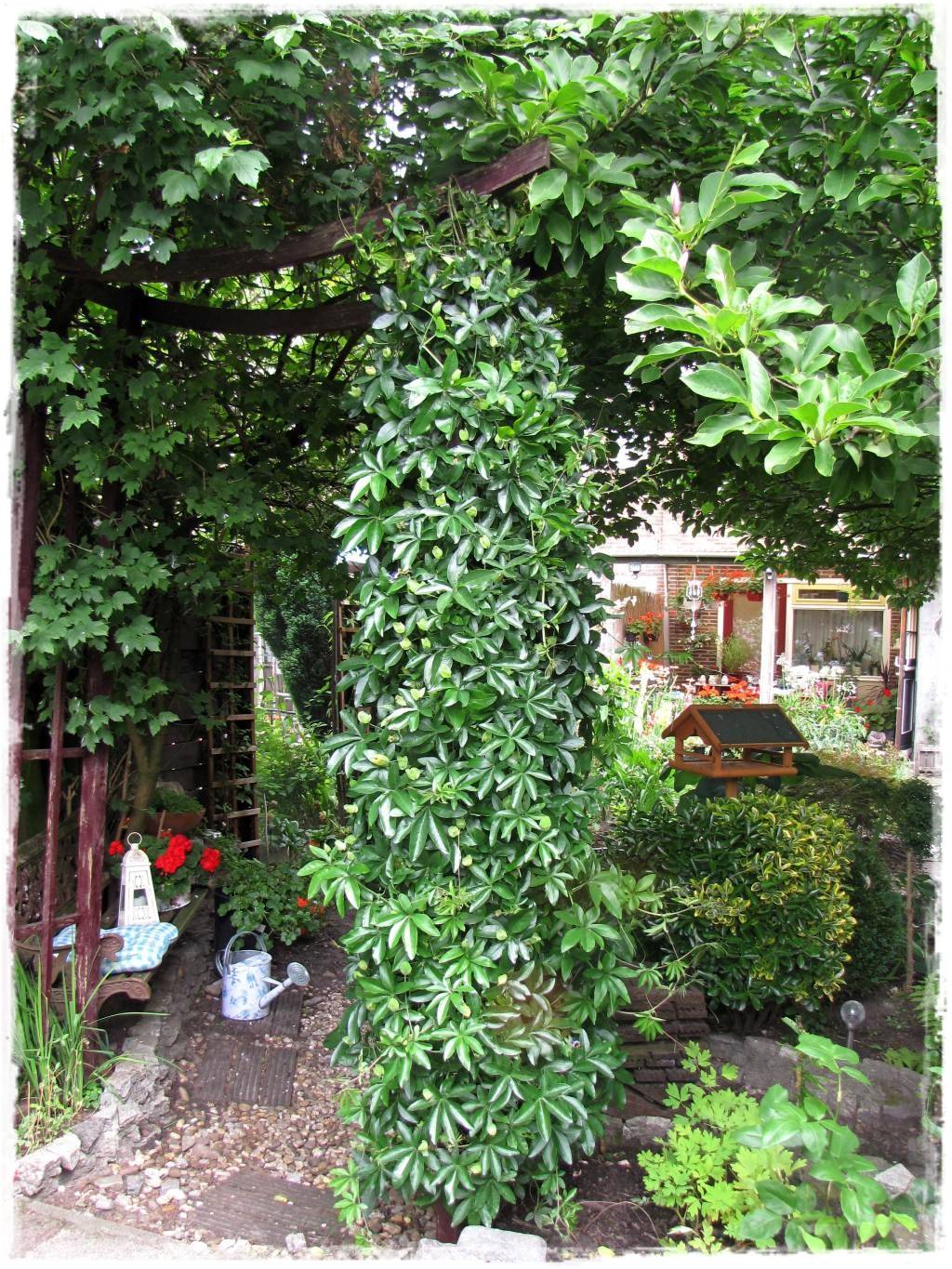 Kawałek dalej moja maleńka szklarenka, która na wiosnę zapełniona jest nowymi sadzonkami, wysianymi kwiatami. pomidorkami koktajlowymi… Przed kaliną pergola z passiflorą… rośnie tam już kilka lat i jest dosyć spora.