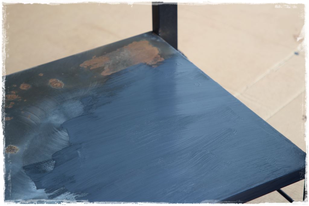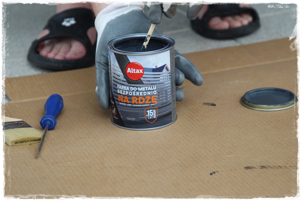 Czynności analogiczne, wykonywane jednak innymi środkami. Zatem po kolei, na początek malowanie elementów metalowych, specjalną farbą do metalu, do stosowania bezpośrednio na rdzę. Którą oczywiście na początku trzeba dobrze wymieszać, przez około 2 – 3 minuty.