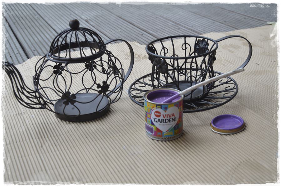 Jako uzupełnienie aranżacji mebli wybrałam zestaw metalowych dekoracji w kształcie filiżanki oraz imbryka. Postanowiłam nadać im nowy, świeży i wiosenny kolor.