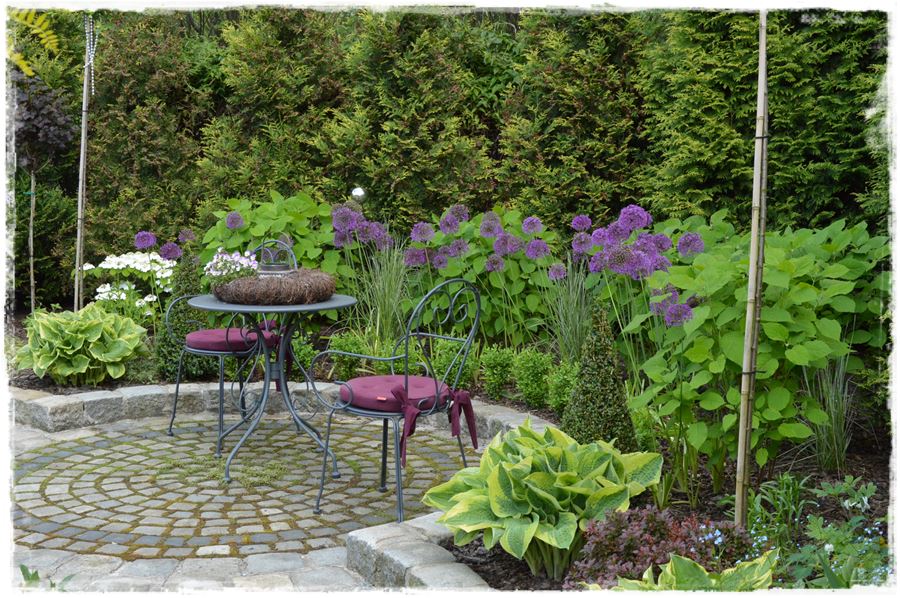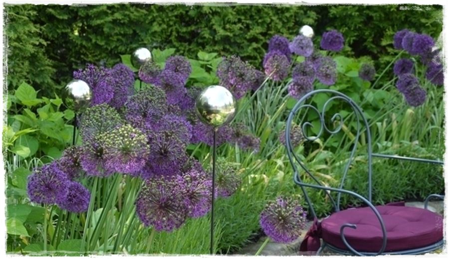 Sezonowymi gwiazdami tego zakątka były czosnki ozdobne „Purple Sensation”, kwitnące w maju.