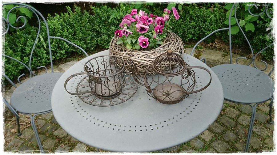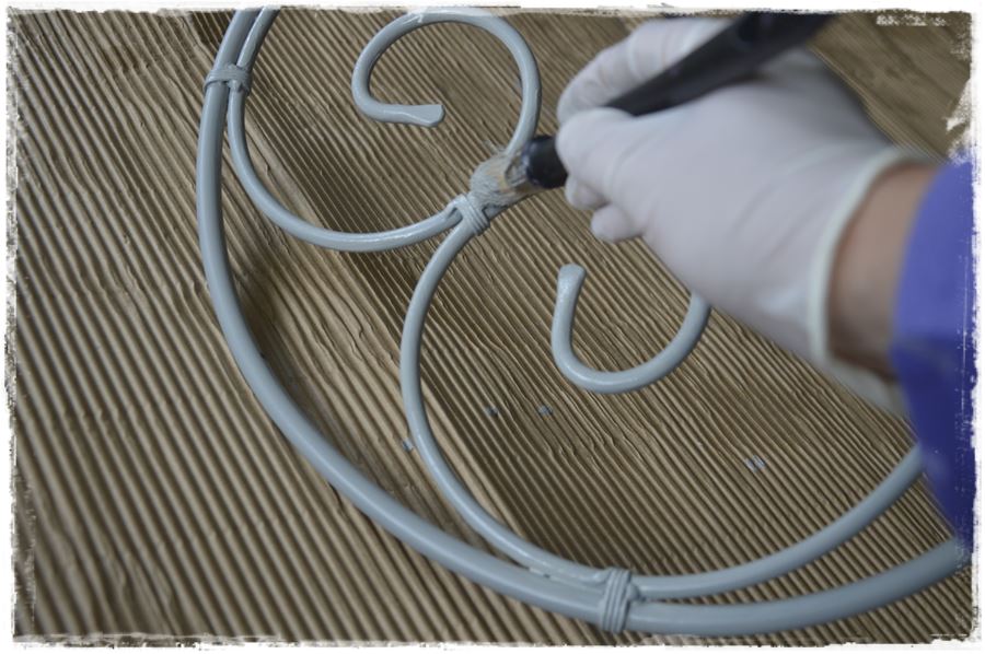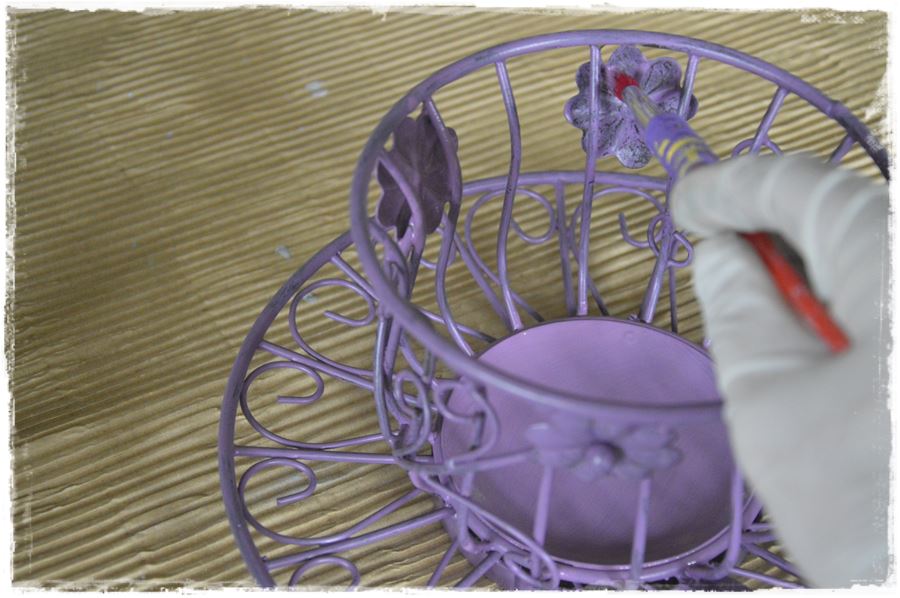 Technika malowania i wszelkie zasady postępowania z farbami są identyczne jak opisane powyżej, przy malowaniu metalowych mebli ogrodowych. Z tą tylko różnicą, że te drobne elementy dekoracyjne, jak ten uroczy zestaw, pomalowałam 2-krotnie, małym, okrągłym pędzelkiem.
