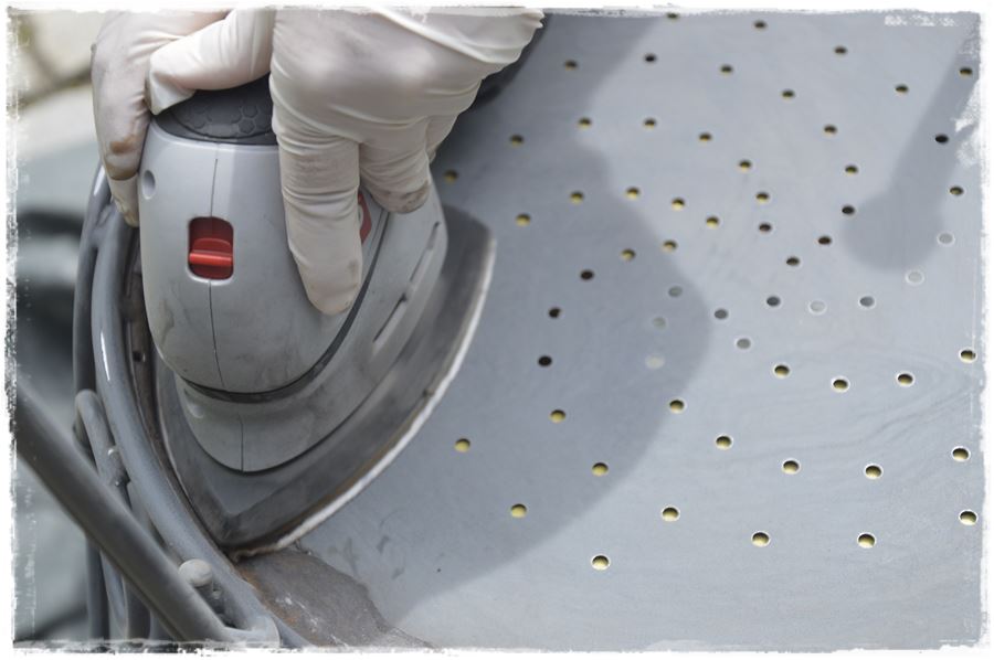 - Pozostałą, starą powłokę lakieru przeszlifuj papierem ściernym lub szlifierką oscylacyjną.
