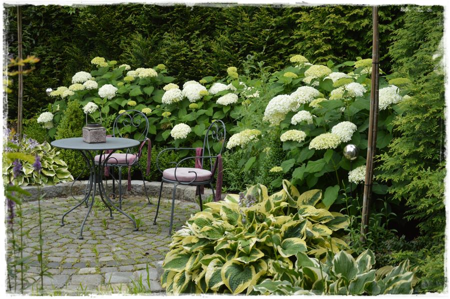Niewielki okrągły placyk wyłożony starą dużą kostką granitową o średnicy 3 m okala 5 hortensji drzewiastych “Anabelle” Hydrangea arborescens Anabelle. Dorastają u mnie do 1,50 m. Uwielbiam je za wcześniejsze w stosunku do innych gatunków hortensji (bukietowych) kwitnienie oraz za ogromne, pachnące, kuliste kwiatostany, które pięknie wyglądają również jesienią,