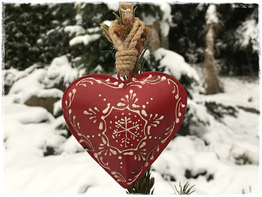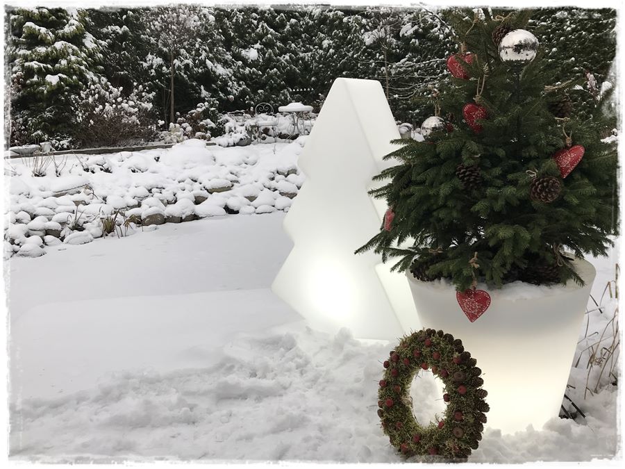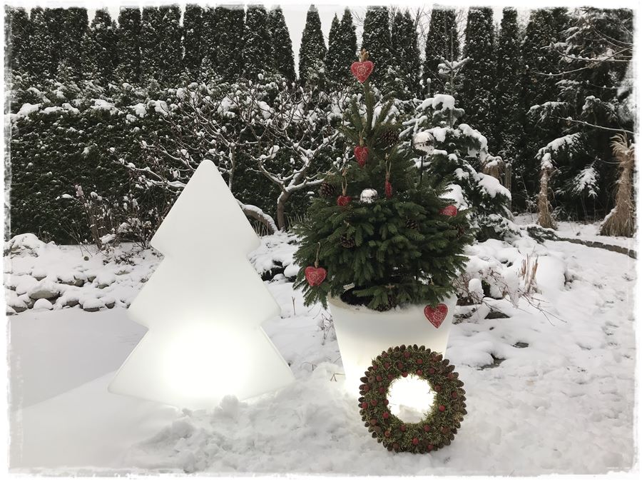 W uzupełnieniu podświetlanej choinki, do świątecznej aranżacji ogrodu wykorzystałam inny produkt tego samego producenta, podświetlaną donicę OVO, w której dobrze komponuje się posadzona, prawdziwa choinka. Wybrałam świerk pospolity zakupiony w donicy, a więc z bryłą korzeniową. Został ozdobiony metalowymi sercami w kolorze czerwonym