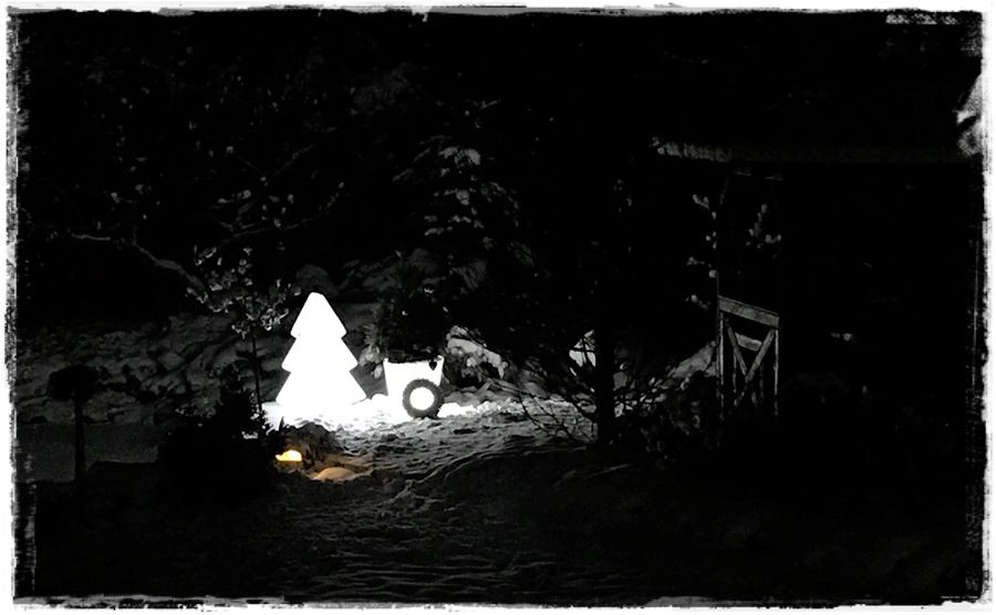 Świąteczny klimat w moim ogrodzie, oprócz wielu innych dekoracji, wprowadzi po prostu świecąca choinka.