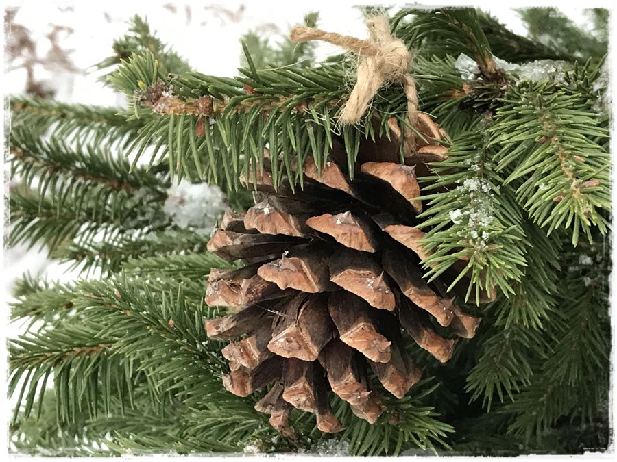 oraz dużymi sosnowymi szyszkami, wprost z mojego ogrodu, zawieszonymi na jutowym sznureczku.