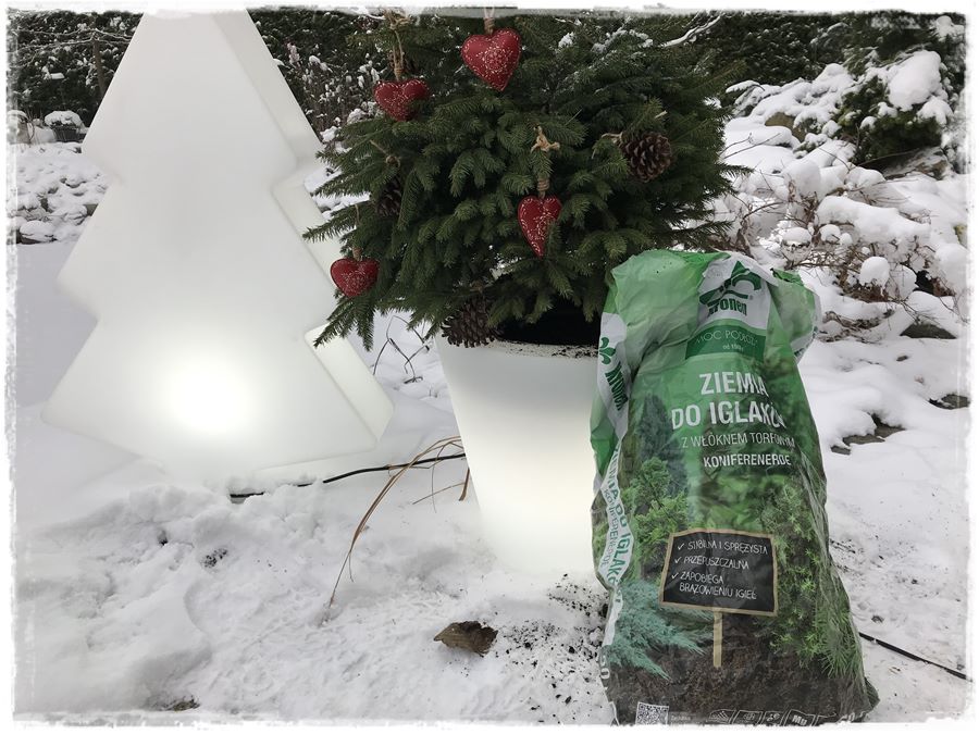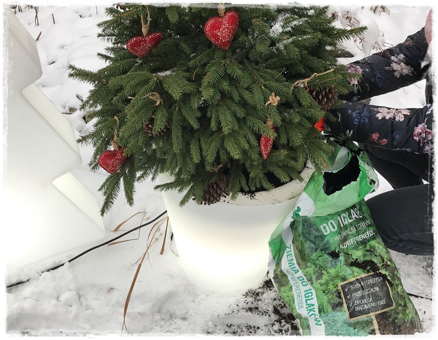 Iglaki, również te w donicach, wymagają podłoża żyznego, o umiarkowanej wilgotności i kwaśnym odczynie, które znalazłam w ofercie KRONEN. Do wypełnienia donicy wybrałam więc ziemię dedykowaną do iglaków z włóknem torfowym.