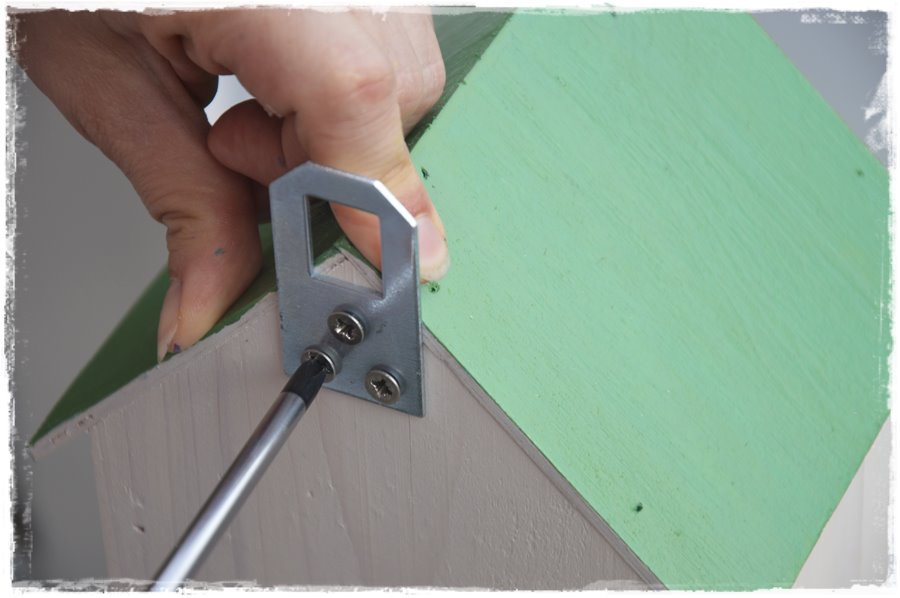 - Ocynkowane uchwyty do zawieszenia budki plus śrubki do wkręcania o długości 16 milimetrów,