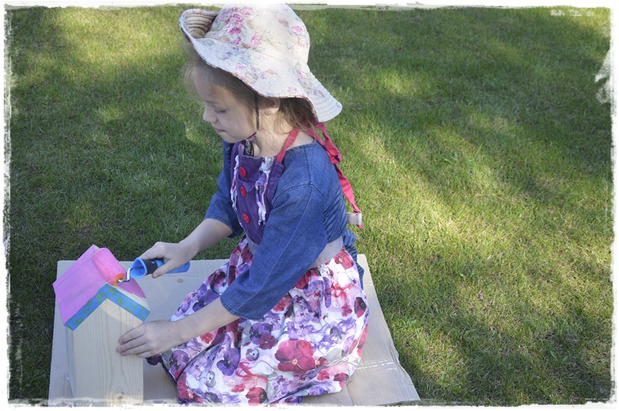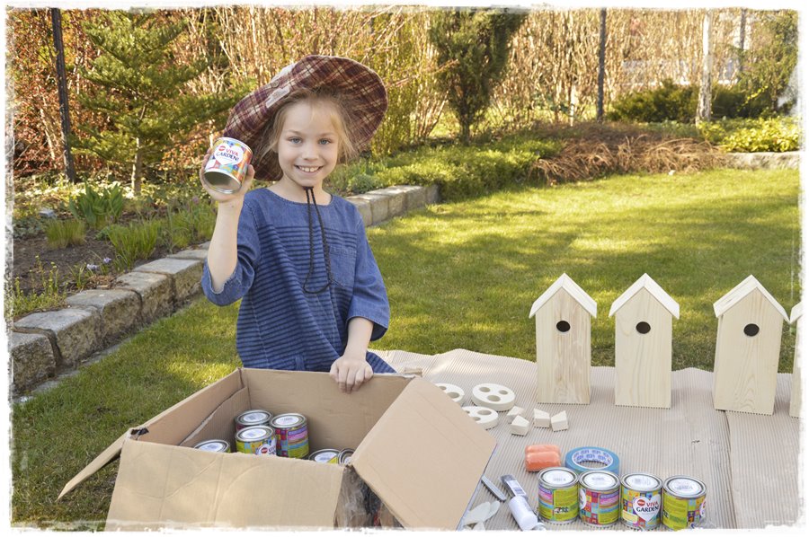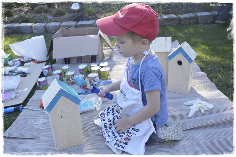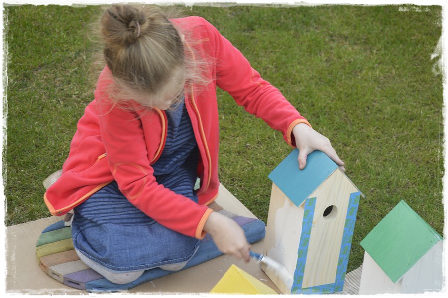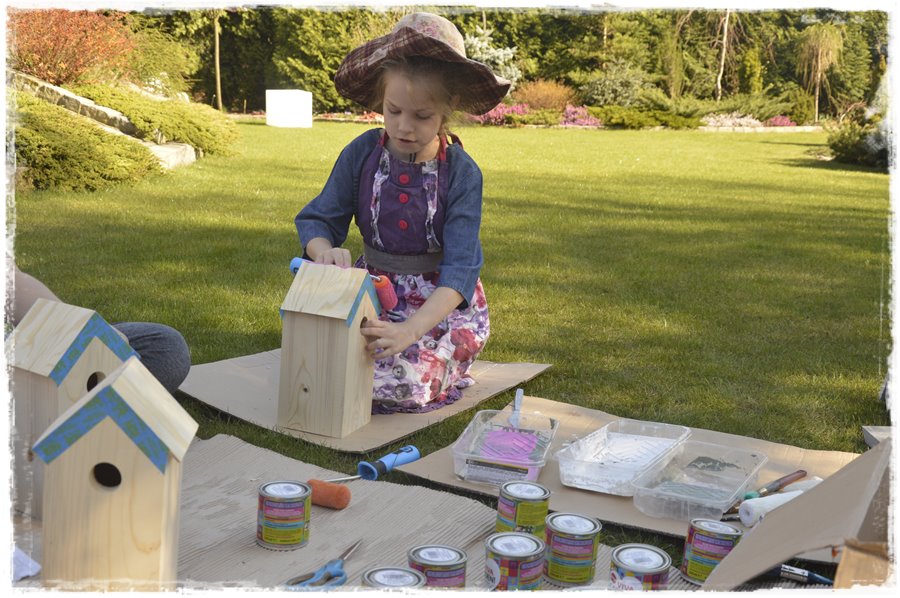 UWAGA: Jeśli zdecydujesz się na malowanie poszczególnych ścianek lub elementów budki różnymi kolorami, przygotuj się na kilkugodzinną pracę z przerwami na oklejanie powierzchni i schnięcie poszczególnych warstw. W czasie przerw znajdź dzieciom inne atrakcyjne zajęcie, np. podlewanie kwiatów, malowanie innych przedmiotów np. doniczek.