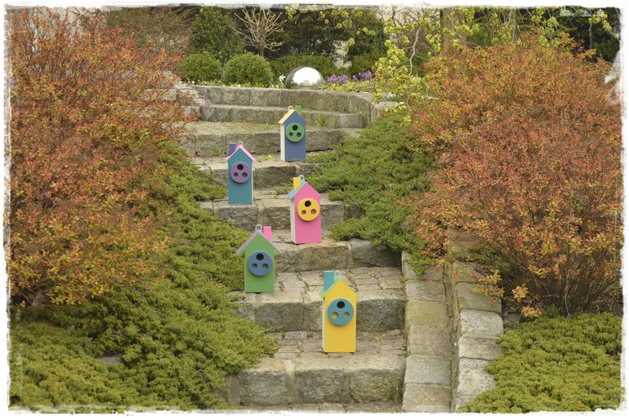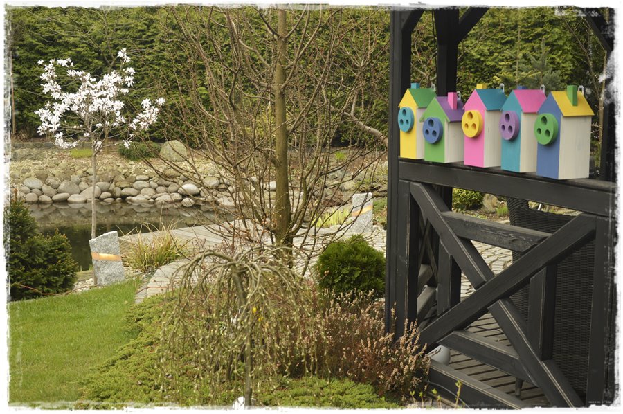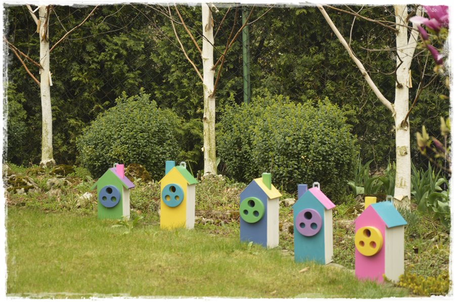 A tak prezentują się na tle mojego ogrodu gotowe budki lęgowe, wykonane według schematu, który znajdziesz poniżej i pomalowane według instrukcji, którą widziałeś powyżej.