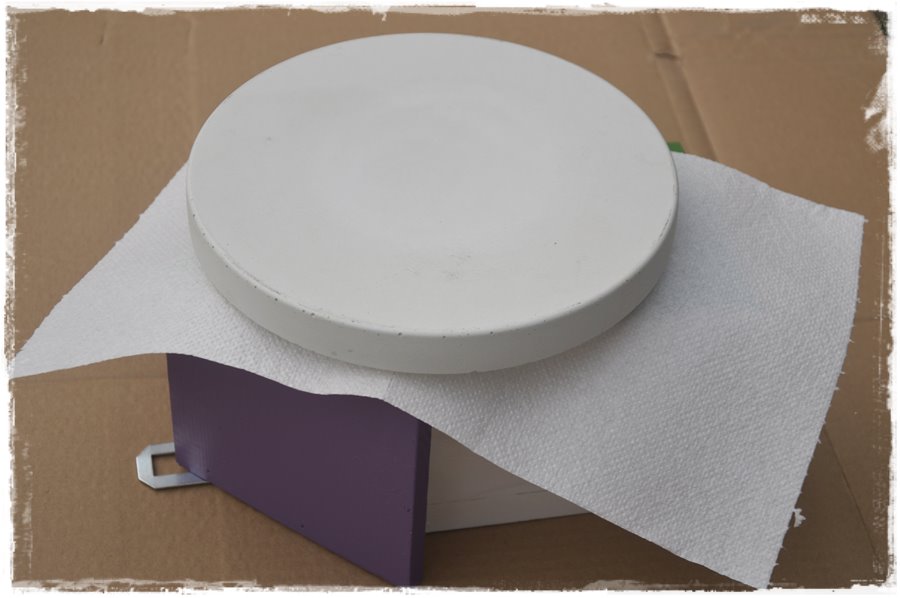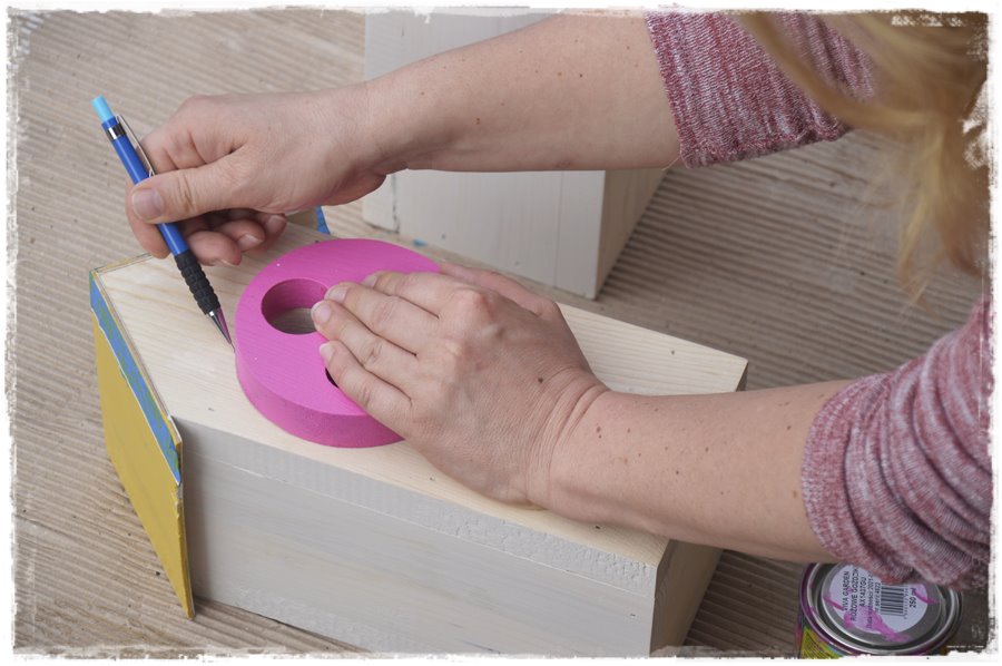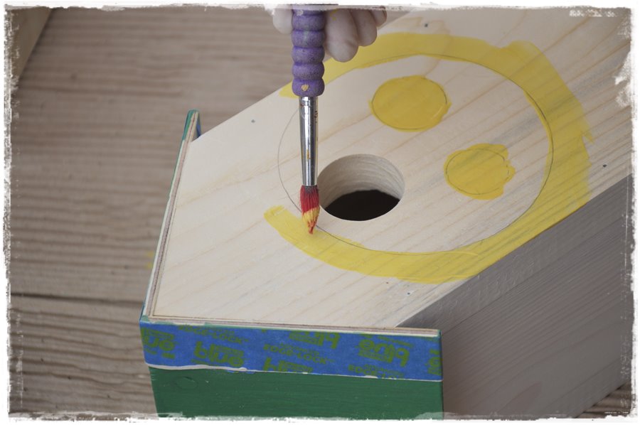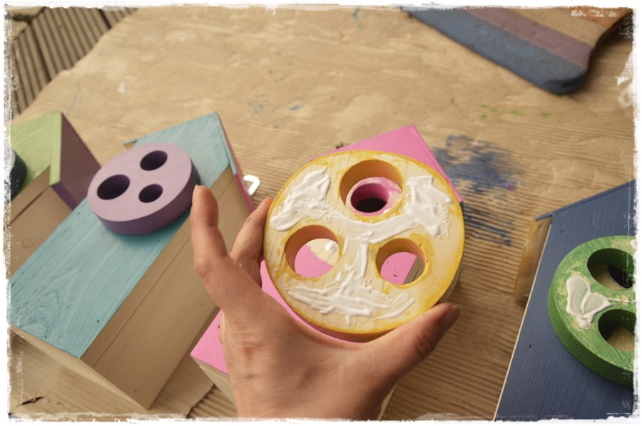 - Okrągłe kominki (krążki doklejane do frontu budki) pomaluj tylko z góry i z boku. Użyj w tym celu pędzla. Zacznij od pomalowania wewnętrznej strony otworów.