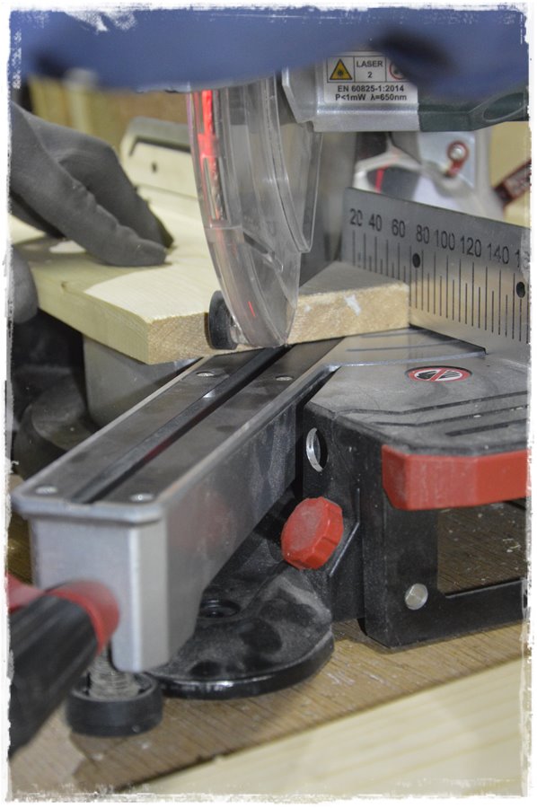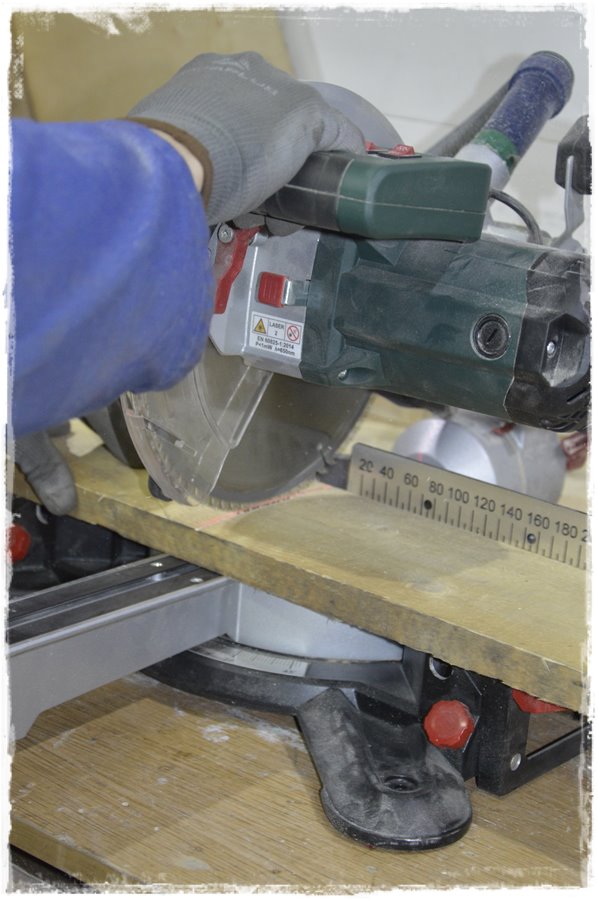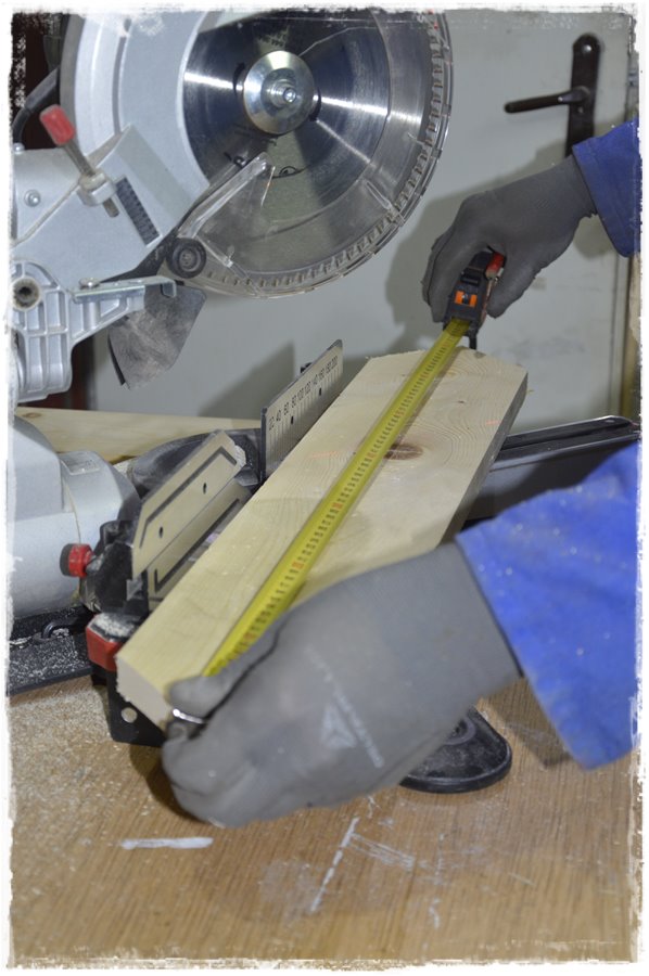 - Przytnij jedną z desek na wymiar: 61 cm długości i 13,5 cm szerokości.