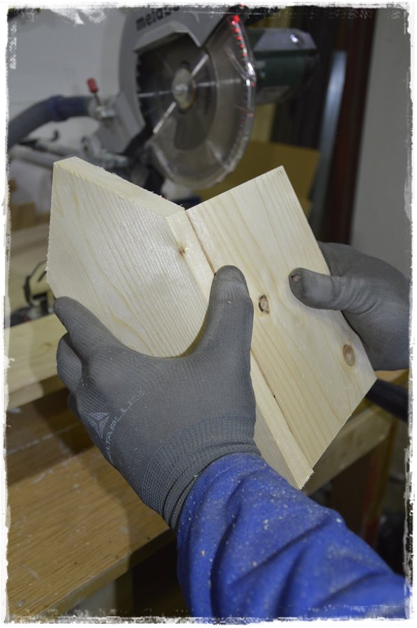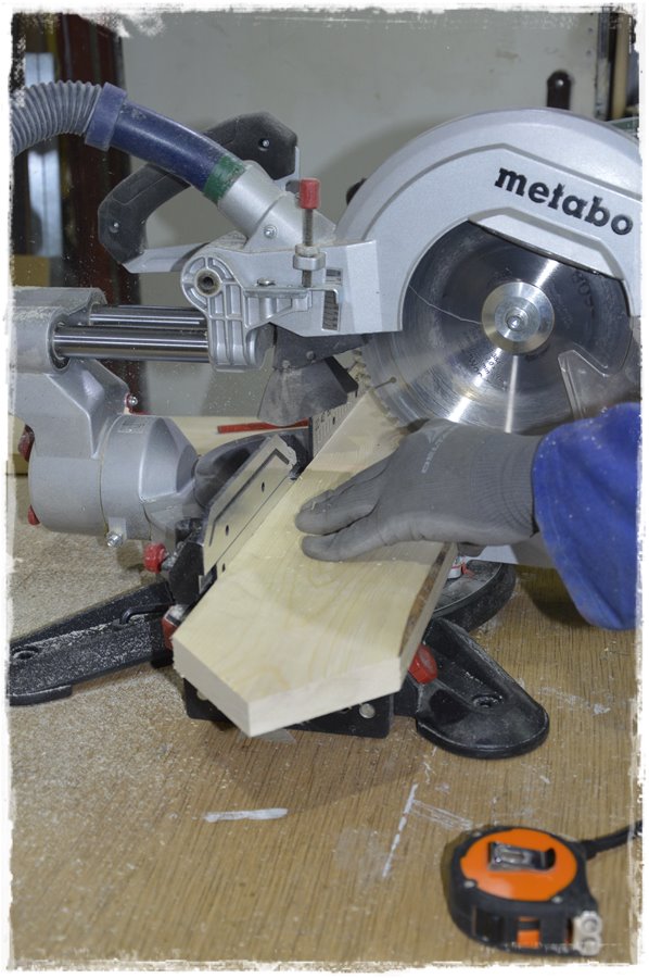 - Na końcach deski po obu stronach zaznacz środek i dotnij oba końce pod kątem 45 stopni.