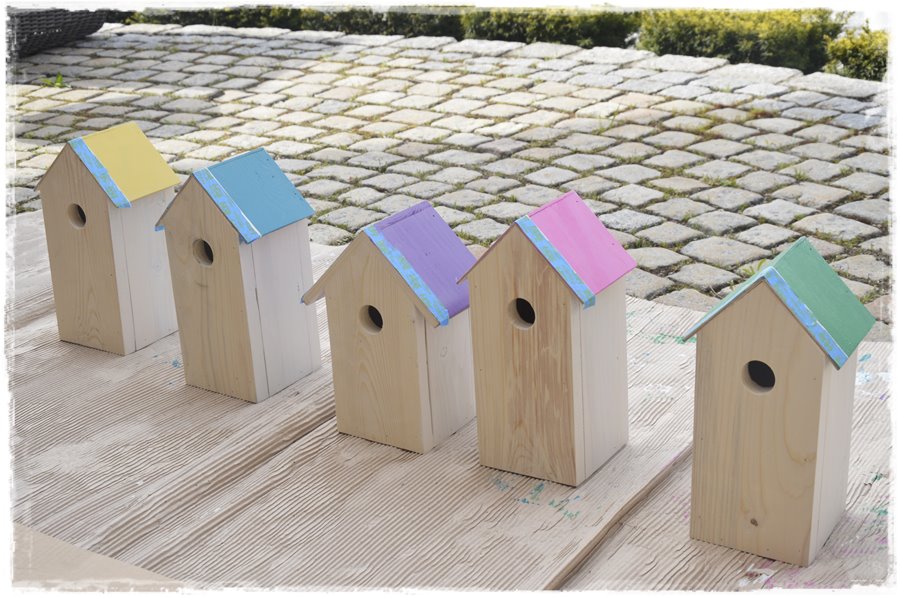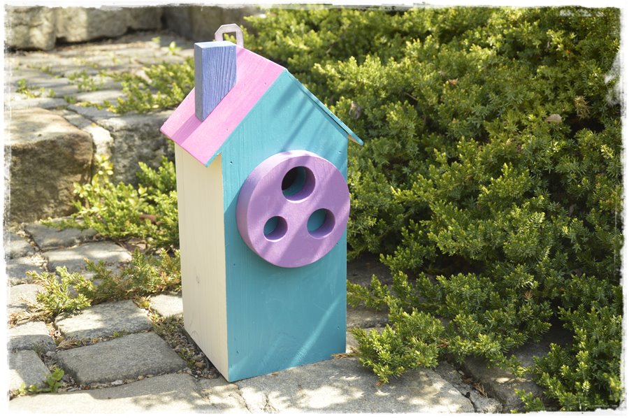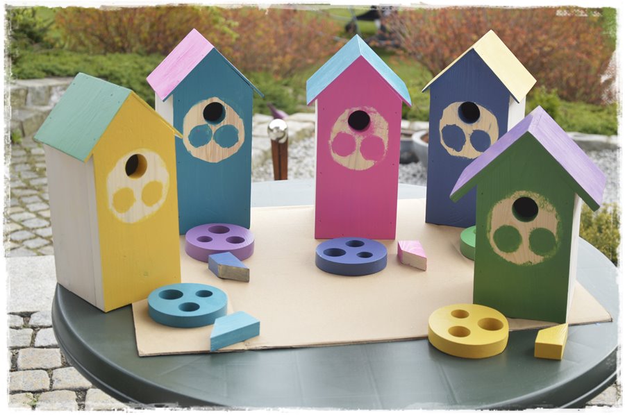 Natomiast bezwzględnie powinieneś zadbać o to, aby surowe domki z drewna (w moim wykonaniu z drewna z odzysku), dzięki cudownym energetycznym kolorom, zyskały jeszcze piękniejszy wizerunek i lepiej przyciągały uwagę ptaków.