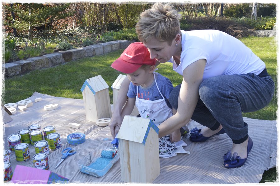 Zachęcam Cię więc do sięgnięcia po pędzle i wałki oraz kolorowe farby. Malowanie budek lęgowych jest to również bardzo fajny temat do wspólnej, kreatywnej zabawy z dziećmi. W swoim ogrodzie, podczas pierwszych wiosennych warsztatów DIY w ramach projektu „Kolorowy ogród cały rok”, jako temat przewodni wybrałam właśnie malowanie budek lęgowych dla ptaków.
