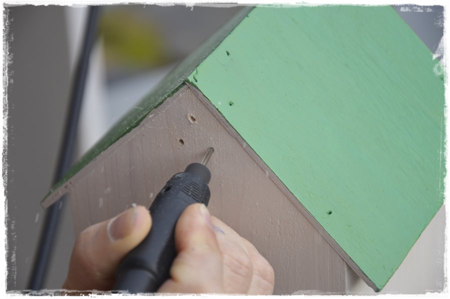 Zwróć uwagę, że nie zamontowałam patyczka przy otworze wlotowym gdyż ptakom jest on zupełnie niepotrzebny. A stanowi jedynie zaproszenie dla kuny czy innego drapieżnika do dobrania się do gniazda (jedną łapą zaczepiają się na patyczku, drugą wybierają jaja lub pisklęta).