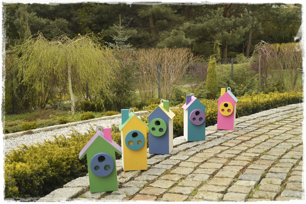 A tak prezentują się na tle mojego ogrodu gotowe budki lęgowe, wykonane według schematu, który znajdziesz poniżej i pomalowane według instrukcji, którą widziałeś powyżej.