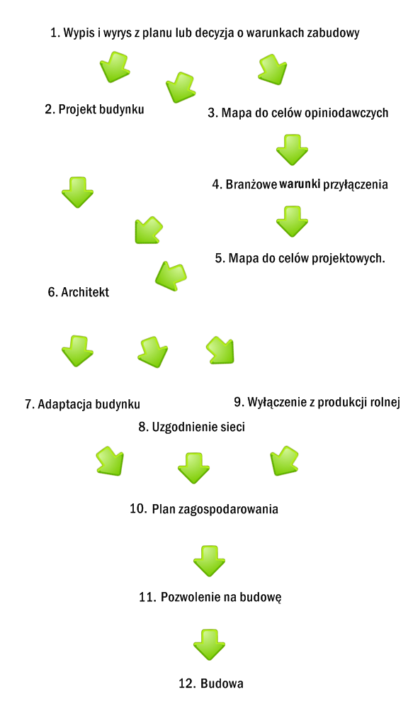 I właśnie ta część trzecia bezpośrednio łączy się z obecnym cyklem, w którym to właśnie plan zagospodarowania również odgrywa znaczącą rolę. Aby nie powielać informacji zawartych w trzeciej części tamtego cylu, wspomnę tylko, że rozpoczynając formalności związane z uzyskaniem pozwolenia na budowę, będziesz potrzebował tzw. wypis i wyrys z miejscowego planu zagospodarowania, stwierdzający, że Twoja działka nadaje się pod zabudowę mieszkaniową jednorodzinną, o której tu rozważamy. A zatem jest to pierwszy punkt na Twojej obecnej drodze, zaznaczony jako ‘1’ na poniższym schemacie, który przed Tobą i który omówię w całym cyklu tych postów.