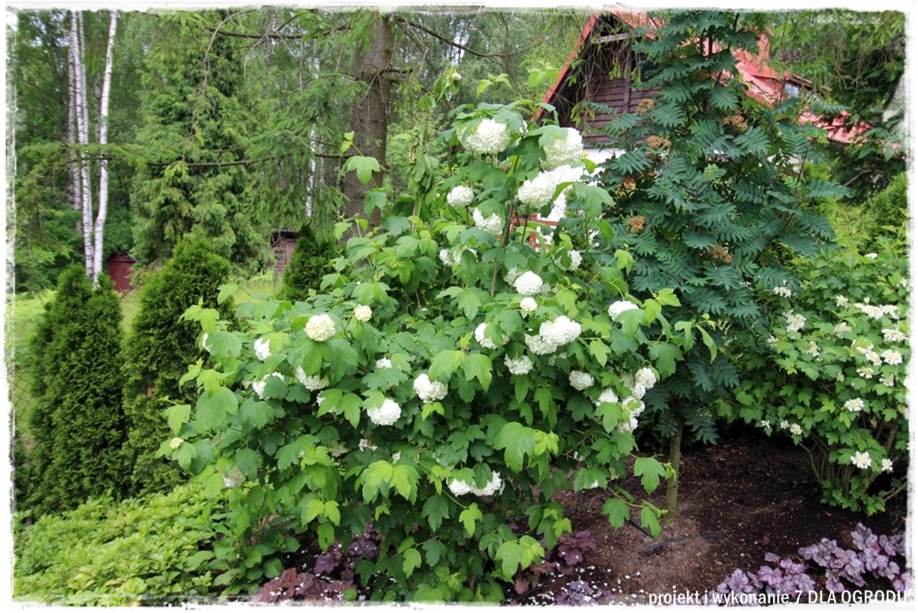 Kwitnie kalina koralowa w odmianie Rosemu, od niej w prawo jarząb pospolity Fastigiata i najbardziej w prawo kalina koralowa Compactum.