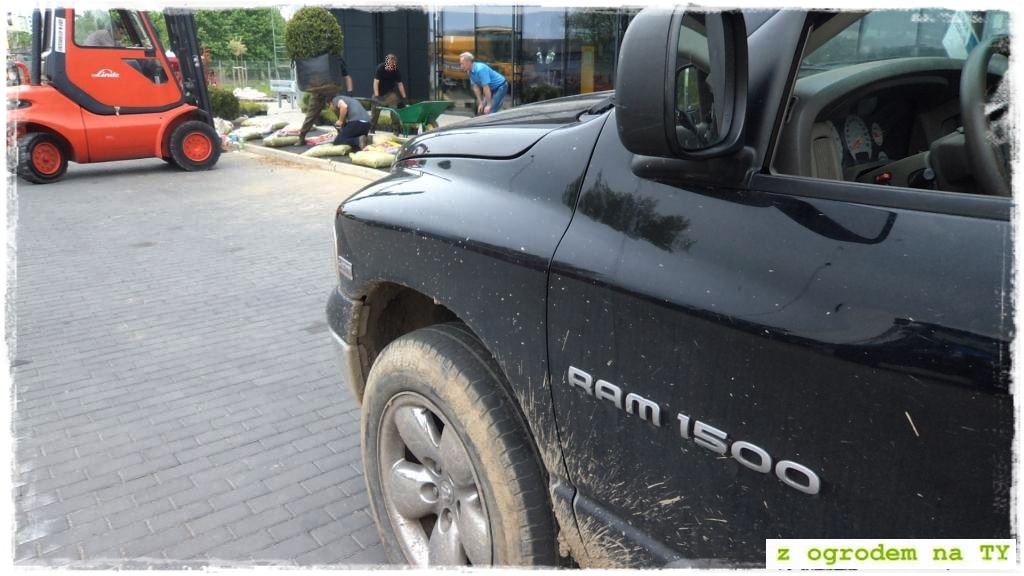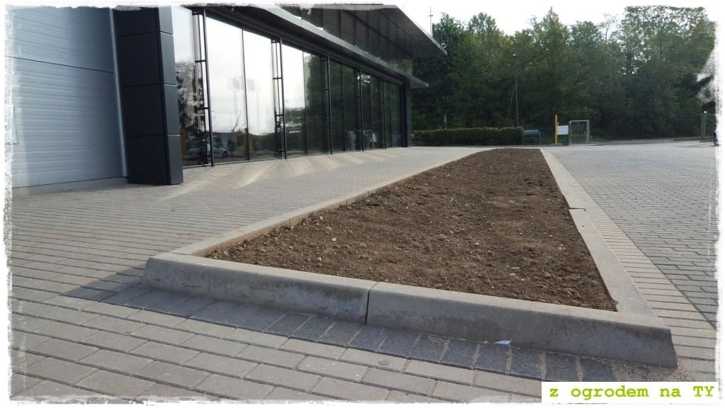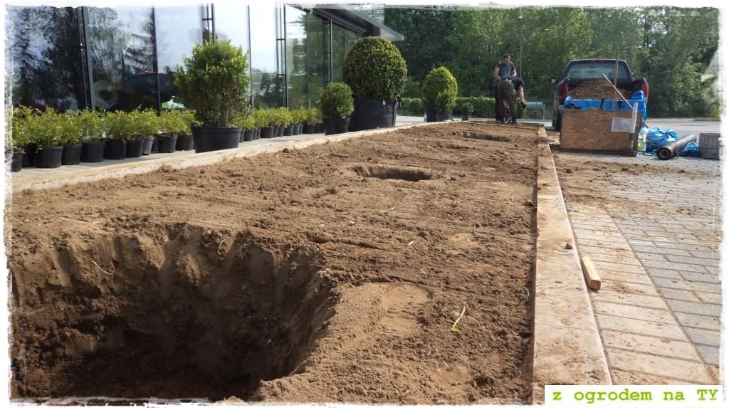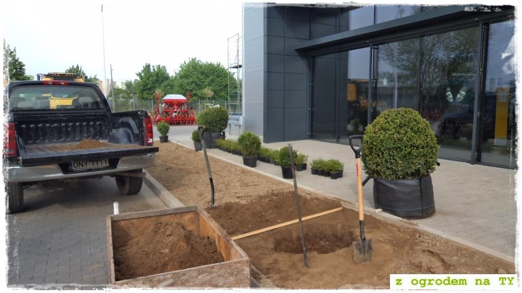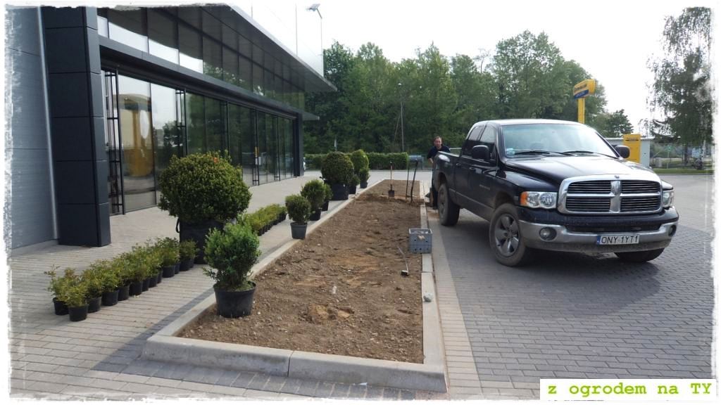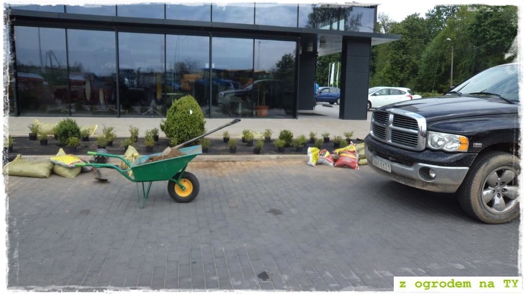 7. Tak wyglądał teren po zebraniu nadmiaru ziemi oraz wykopaniu dołów pod główne rośliny, czyli 9 bukszpanów. Tutaj muszę wtrącić zasadność pierwszego ze specjalnych dzisiaj sprzętów tj. samochodu pick-up, którego używamy do różnego rodzaju zadań specjalnych. Nadaje się on do tego jak mało jaki samochód, przede wszystkim ze względu na dużą ładowność oraz moc, którą mam z 5,7 litrowego silnika. To prawdziwy potwór, który właśnie był nam potrzebny. Trudność naszego zadania polegała między innymi na tym, że działaliśmy na terenie firmy, który jest pięknie zagospodarowany i zadbany. A sama nasza rabata znajduje się na wprost okazałego budynku i otoczona jest brukowaną nawierzchnią. W związku z tym nie było możliwości zrzucania ziemi na kostkę, a trzeba ją było ładować bezpośrednio na samochód i sukcesywnie wywozić.