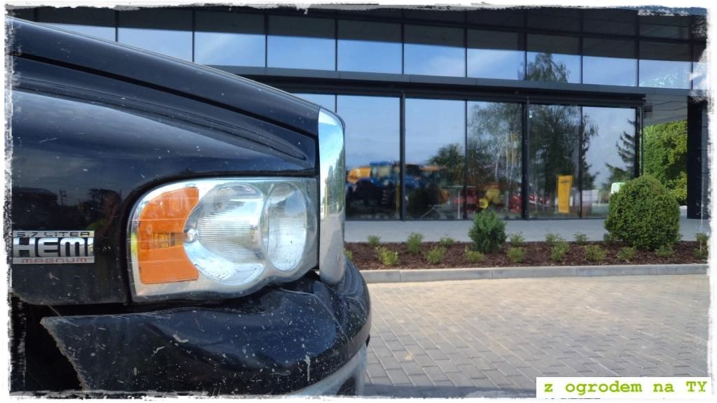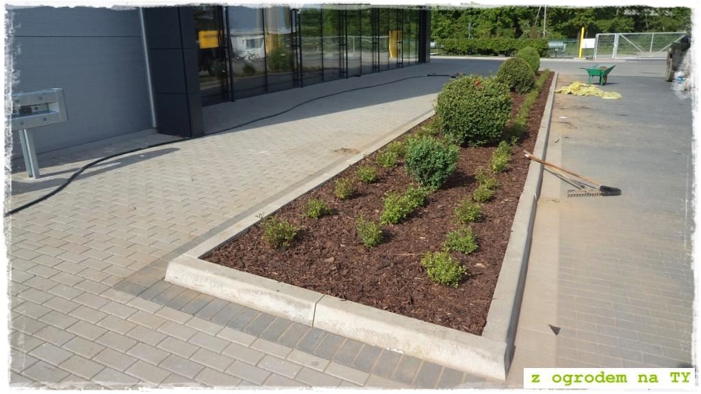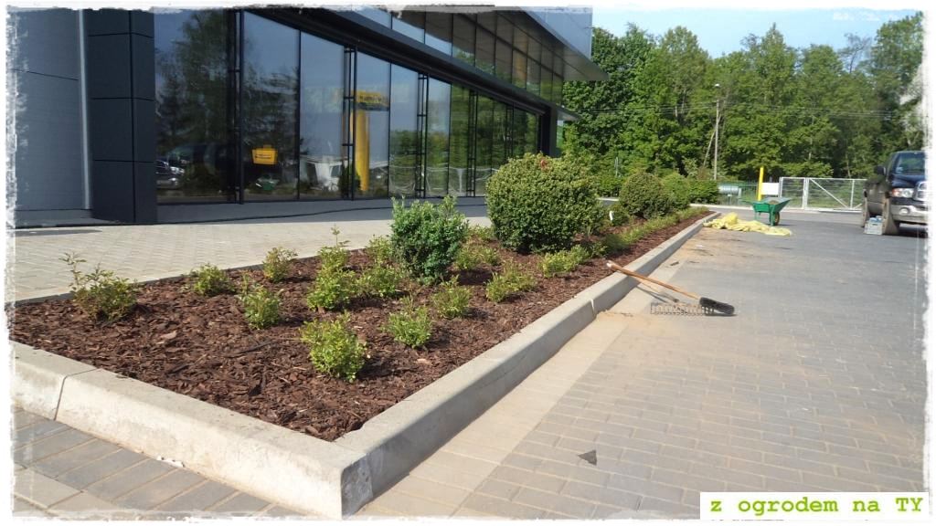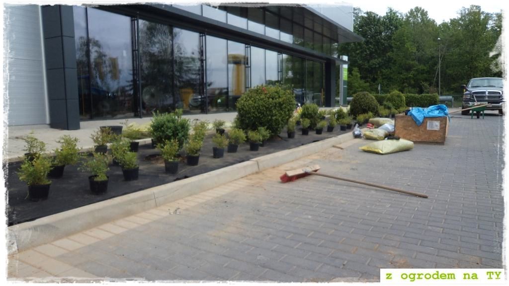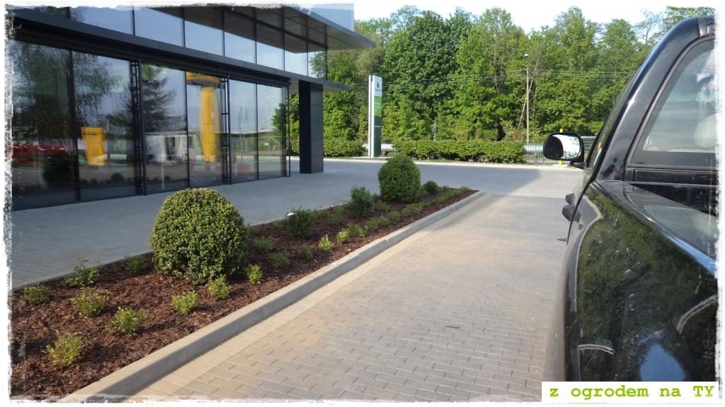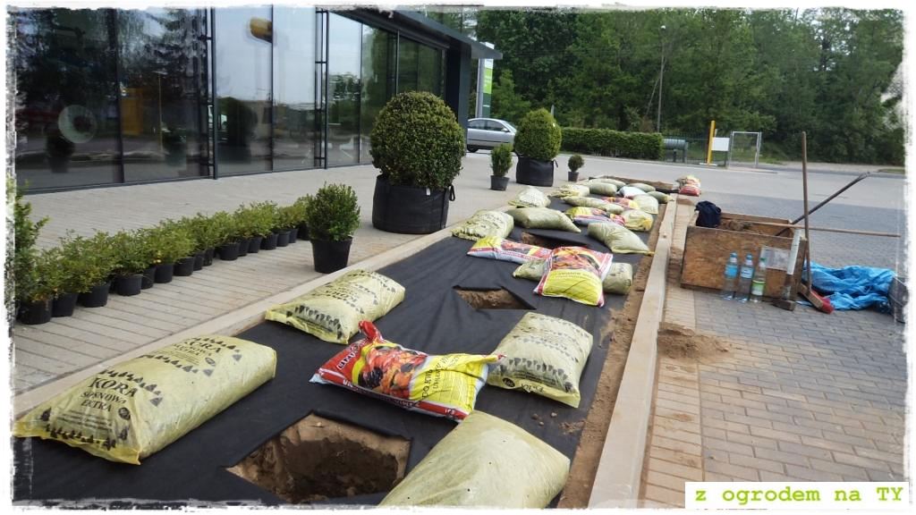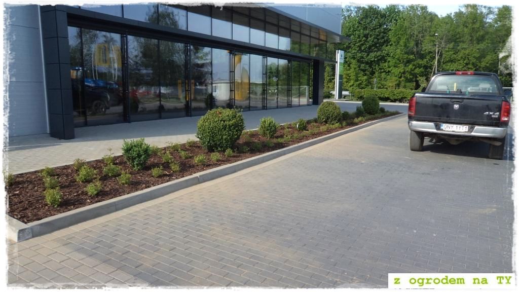 7. Tak wyglądał teren po zebraniu nadmiaru ziemi oraz wykopaniu dołów pod główne rośliny, czyli 9 bukszpanów. Tutaj muszę wtrącić zasadność pierwszego ze specjalnych dzisiaj sprzętów tj. samochodu pick-up, którego używamy do różnego rodzaju zadań specjalnych. Nadaje się on do tego jak mało jaki samochód, przede wszystkim ze względu na dużą ładowność oraz moc, którą mam z 5,7 litrowego silnika. To prawdziwy potwór, który właśnie był nam potrzebny. Trudność naszego zadania polegała między innymi na tym, że działaliśmy na terenie firmy, który jest pięknie zagospodarowany i zadbany. A sama nasza rabata znajduje się na wprost okazałego budynku i otoczona jest brukowaną nawierzchnią. W związku z tym nie było możliwości zrzucania ziemi na kostkę, a trzeba ją było ładować bezpośrednio na samochód i sukcesywnie wywozić.