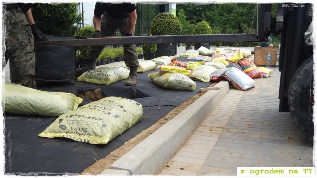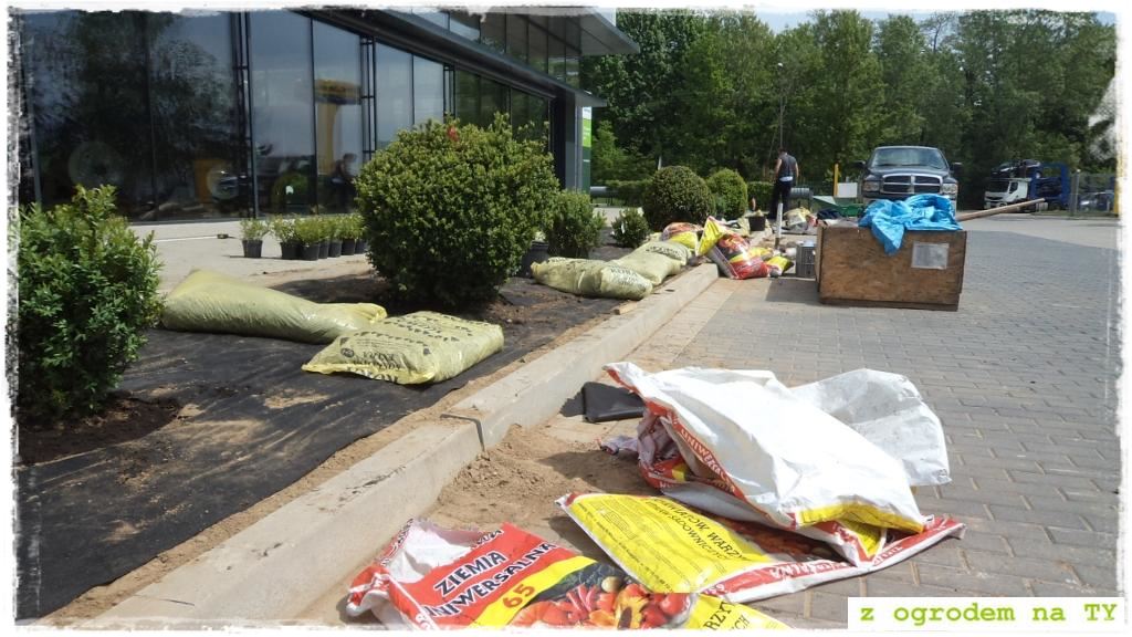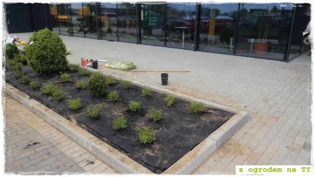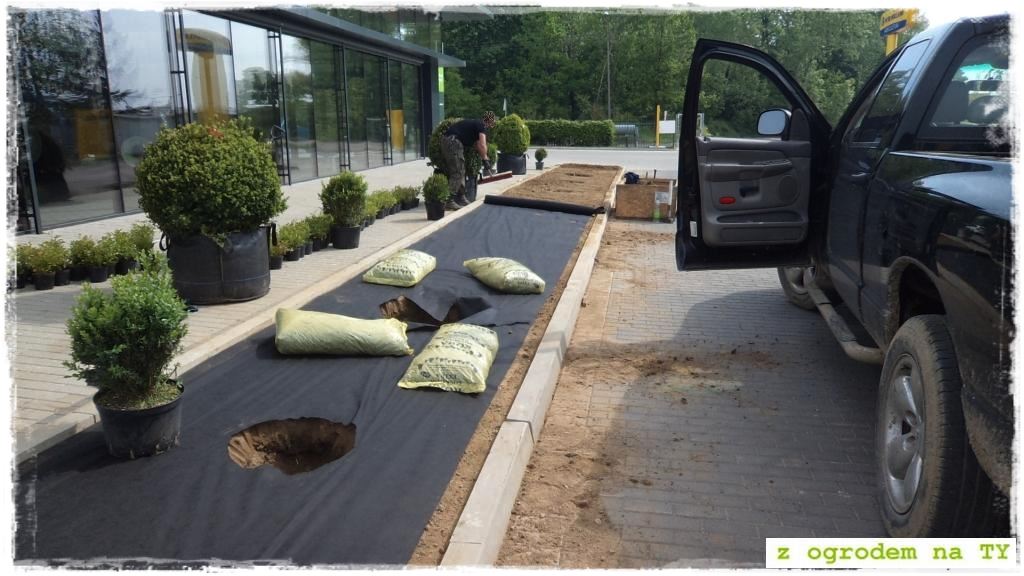 13. Po rozmierzeniu, czyli wyznaczeniu punktów na agrowłókninie, należało ją ponacinać w formie znaku „X”, rozchylić, małą łopatką, wykopać dołki i zasadzić używając ziemi ogrodniczej. Następnie agrowłókninę ponownie nakryć i tak tą czynność powtórzyć sto razy. Oczywiście ziemię z wykopanych dołków zapakować na samochód.