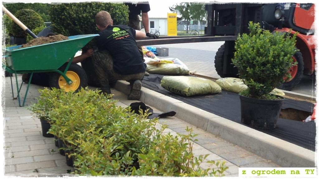 10. Krok dziesiąty to najtrudniejszy element dzisiejszego dnia. Wsadzenie do dołów trzech największych bukszpanów. Zadanie trudne ponieważ każdy z bukszpanów ważył około 200 kilogramów i ręczne wykonanie nie wchodziło w rachubę. Przede wszystkim dlatego, że nie było możliwości podniesienia rośliny, zdjęcia worków i wyjęcia jej, a następnie, bez uszkodzenia, umieszczenia w przygotowanych otworach. Dlatego do akcji wkroczył drugi ze specjalnych sprzętów w tym zadaniu, a konkretnie podnośnik widłowy. Przy jego pomocy możliwe było najpierw rozładowanie roślin po przywiezieniu, a następnie umieszczenie w przygotowanych otworach. Rośliny były unoszone w workach, następnie w powietrzu worki były rozcinane tak aby rośliny nie wypadły, a jednocześnie aby można było worek wyjąć po opuszczeniu do dołu. To niezwykle trudna czynność, która w tym zadaniu zajęła nam przeszło dwie godziny.