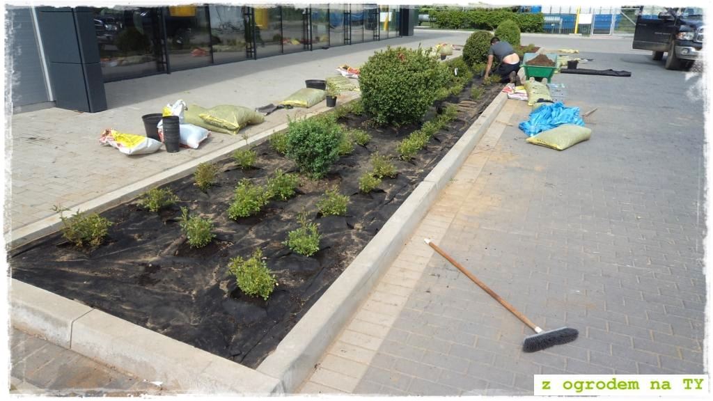 15. Podlewanie i sprzątanie. Czynności końcowe, oczywiste. Rośliny nowo posadzone należy zasilić wodą, a teren po wykonaniu prac posprzątać. Szczególnie realizując prace w tak zadbanym miejscu. Wszystkie pozostałe worki, doniczki i inne elementy musieliśmy posprzątać, nasze narzędzia i sprzęt popakować, a na zakończenie cały teren starannie pozamiatać i pozbierać resztki ziemi, które chcąc czy nie chcąc zawsze będą.