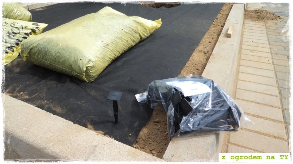 8. Krok kolejny to rozwinięcie agrowłókniny. I tutaj wyjaśnić muszę pewną nieścisłość, którą być może zauważyłeś czytając uważnie wstęp. Powierzchnia rabaty wynosi 36,7 metra kwadratowego, a agrowłókniny zużyto metrów 41. Różnica wzięła się z tego, że szerokość rabaty wynosi 1,7 metra, a szerokość beli agrowłókniny tylko 1,5 metra. W związku z czym brakujący pasek pokryto dodatkowym kawałkiem, stosując zakładkę o szerokości 20 centymetrów. I właśnie ta zakładka, na długości 21,6 dała dodatkowe 4,3 metra kwadratowego agrowłókniny.