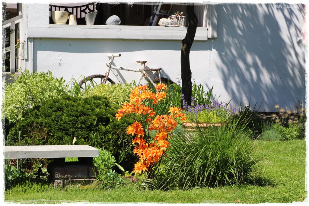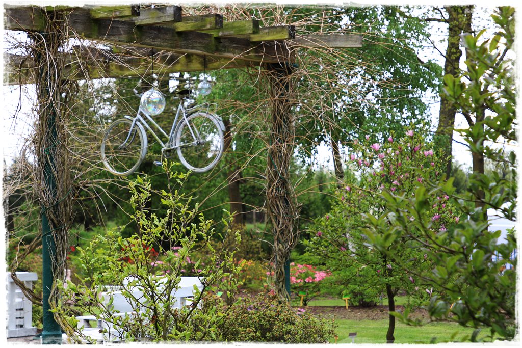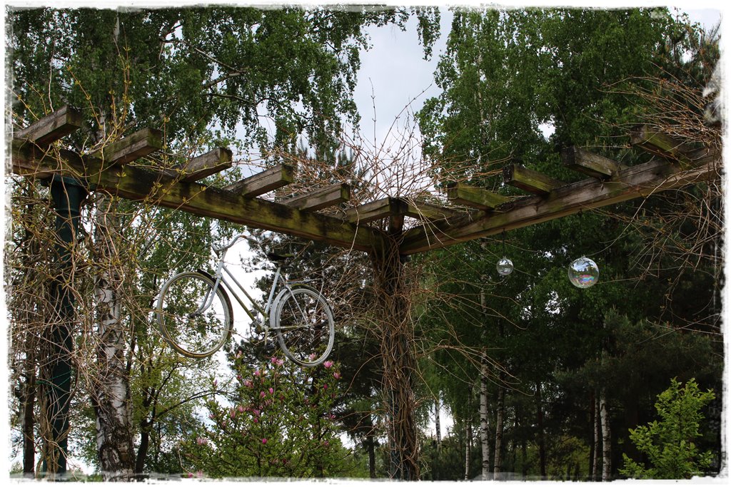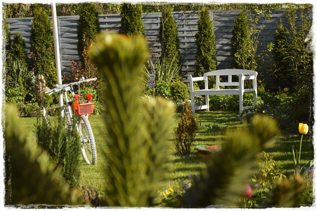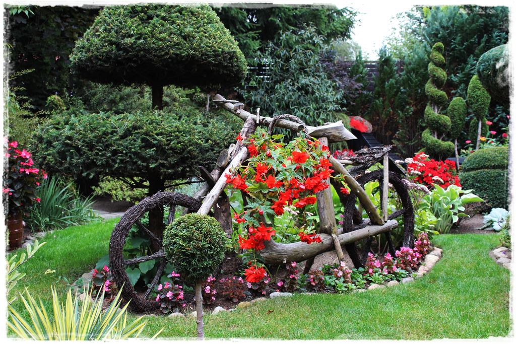Jak widzisz na powyższych przykładach, rower w ogrodzie może grać różne role. Jednak to jeszcze nie wszystko. Bo poza rowerami prawdziwymi, spotkałem się również z takimi, które rowery po prostu udają. Na przykład takie, będące imitacją wykonaną z drewna: