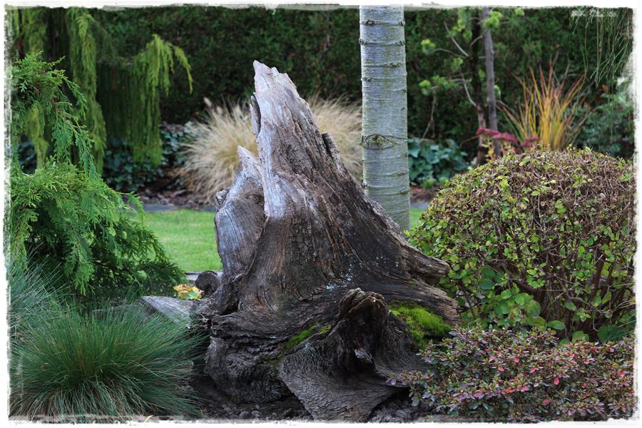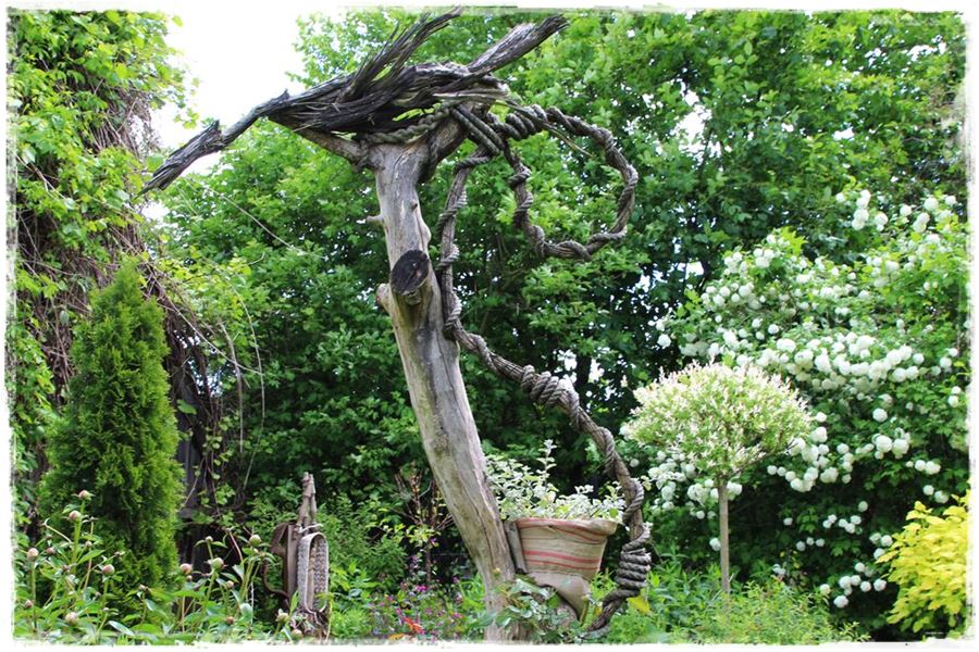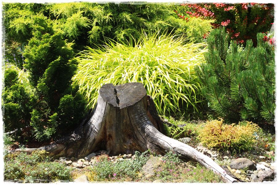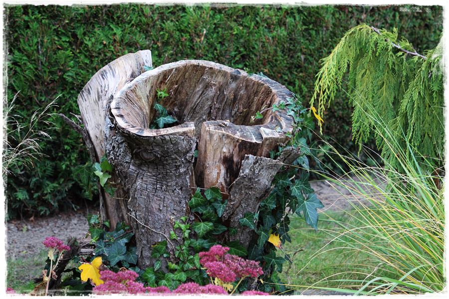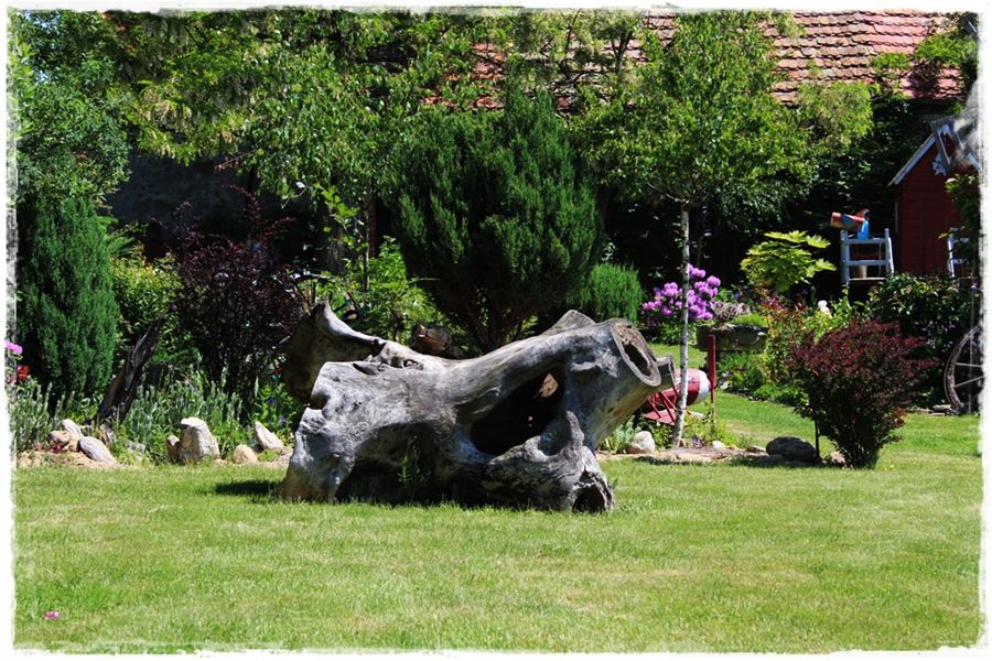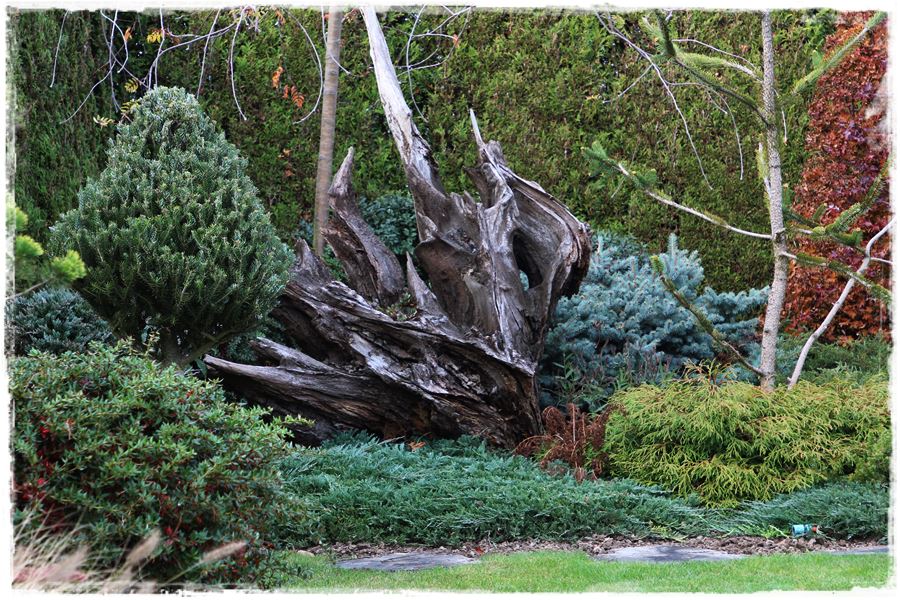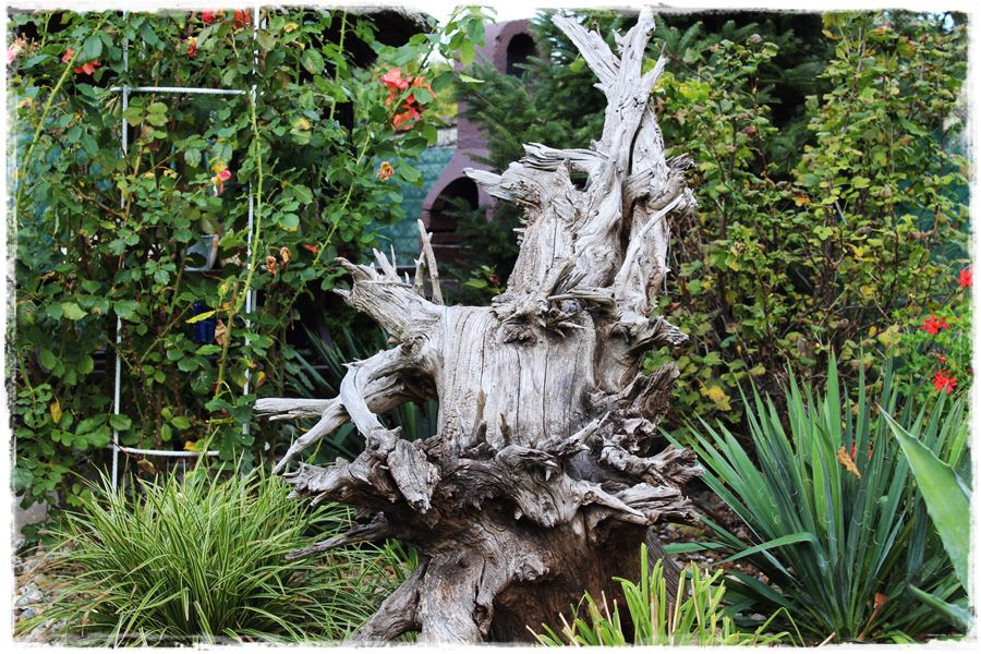 Szczególnym rodzajem oryginalnych rzeźb w ogrodzie są stare korzenie i pnie, które bez szczególnego ozdabiania, same w sobie stanowią ciekawą dekorację.