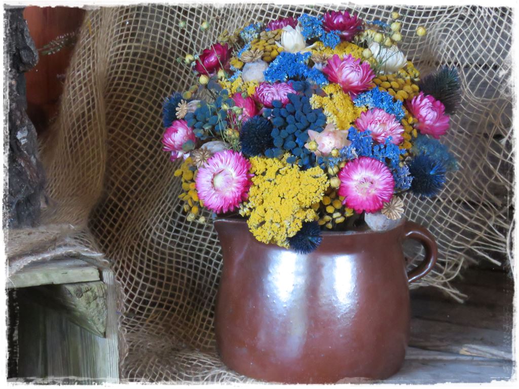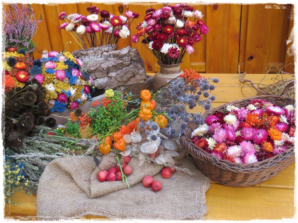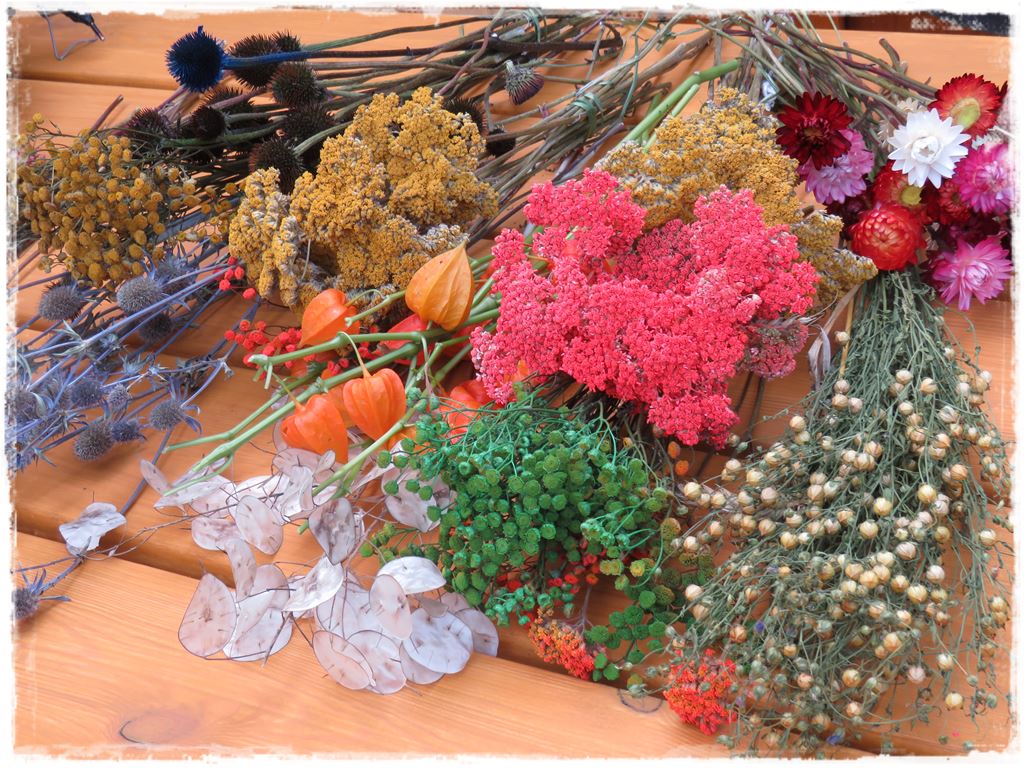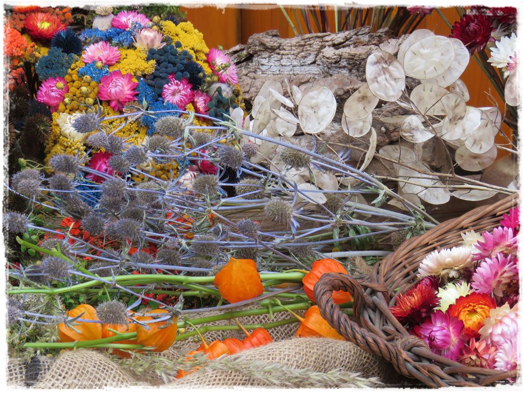 Zasuszone kwiaty, zioła, zboża: zatrwiany, krwawniki, mikołajek alpejski, jeżówka purpurowa.