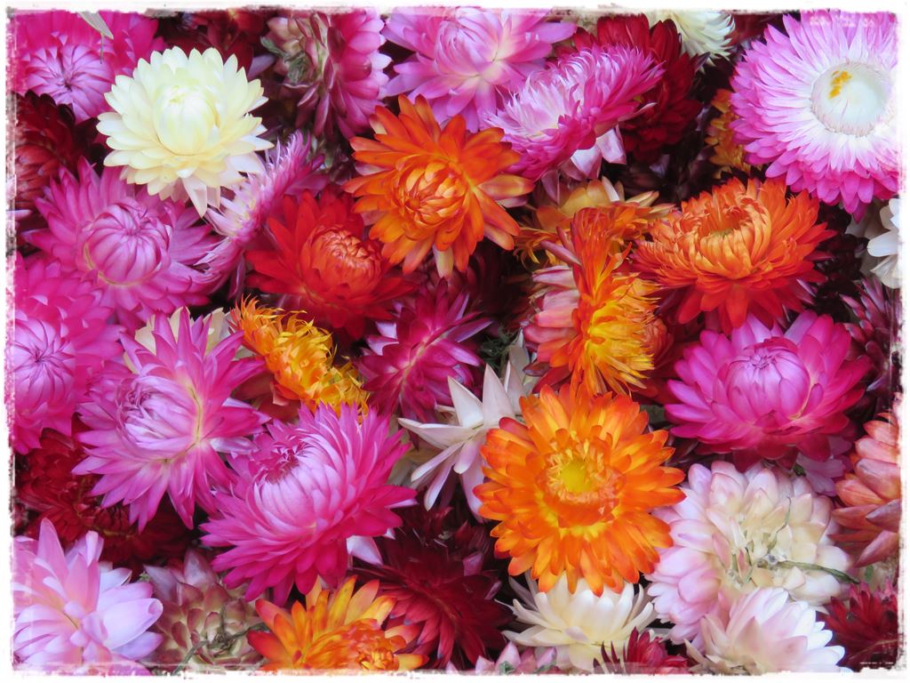 Kwiaty suchołusek, znanych też pod nazwą: kocanka ogrodowa, nieśmiertelnik, słomianka.