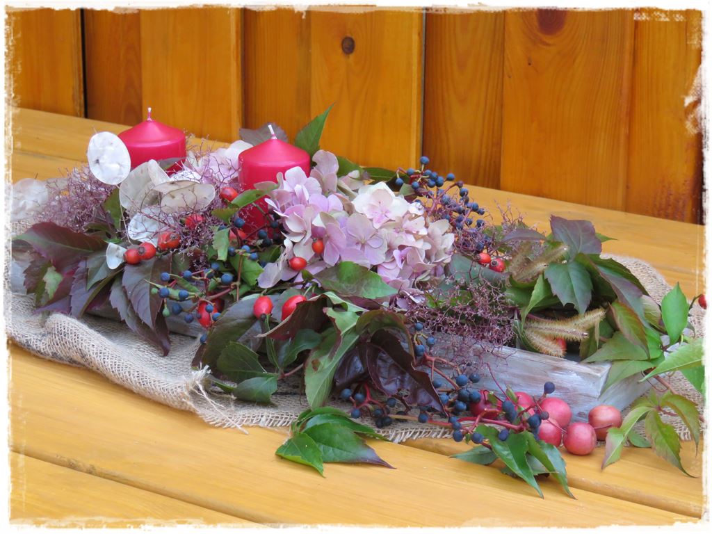 Tymczasem aby nie przedłużać, wróćmy do jesiennych dekoracji. Czyli dekoracji powstałych z roślin dostępnych o tej porze roku w ogrodzie. A przypomnę, że to wyjątkowo hoja pora, jest więc w czym wybierać.