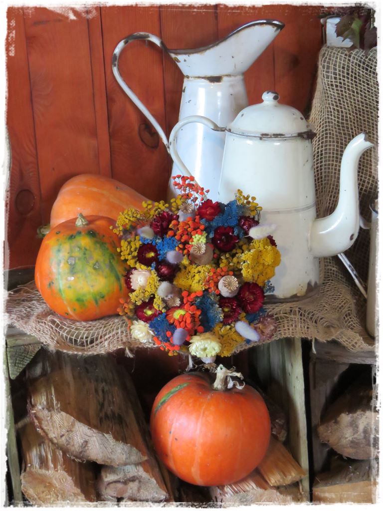 Jesienne dekoracje bardzo ładnie komponują się również ze starymi przedmiotami, można nawet powiedzieć “przeżywającymi jesień swojego życia”.