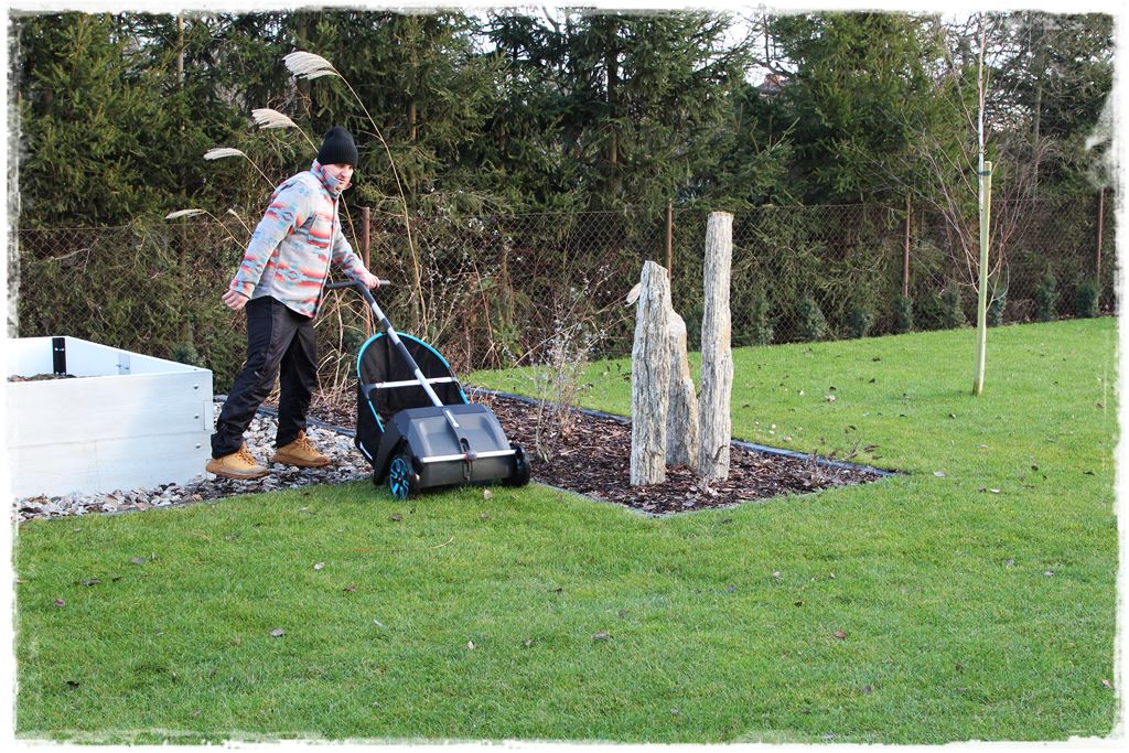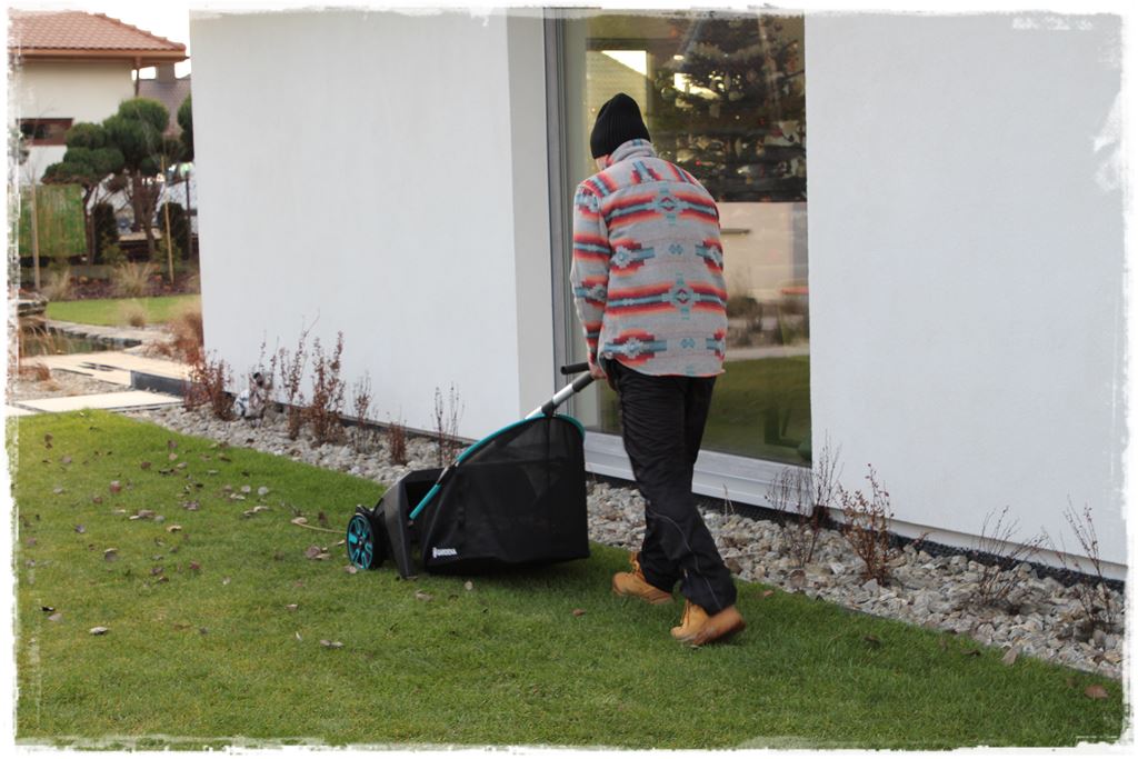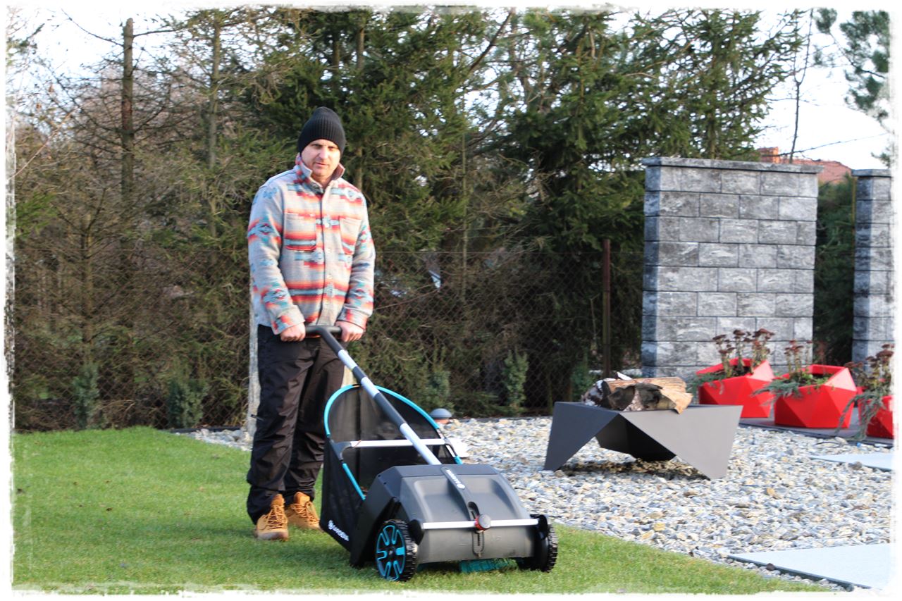 Na przykład właśnie trawnika, czy jakiejś utwardzonej nawierzchni, o którą szczotki zawsze powinny delikatnie ocierać, umożliwiając dokładne zbieranie liści. Sama praca zbieraczem jest niezwykle lekka i bez schylania umożliwia dokładne wysprzątanie. Ponadto jest przyjemna i powiem, że mocno “wciąga”.