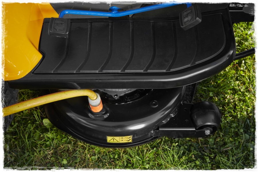 Złącze do podłączenia węża umożliwia łatwe mycie agregatu tnącego, co jest innowacyjnym rozwiązaniem w urządzeniach akumulatorowych.