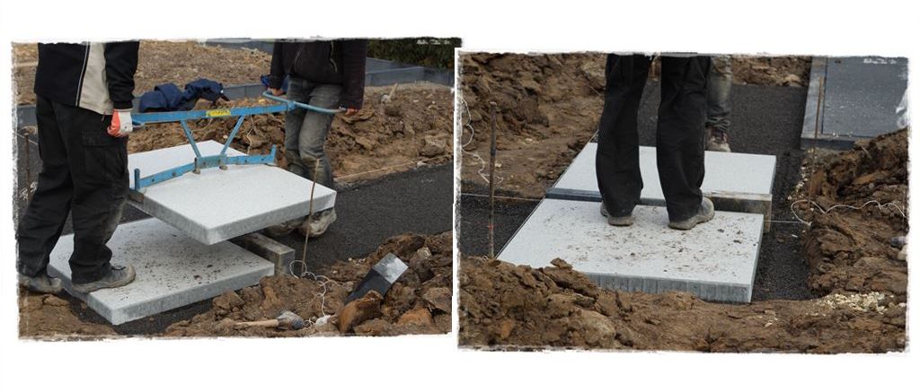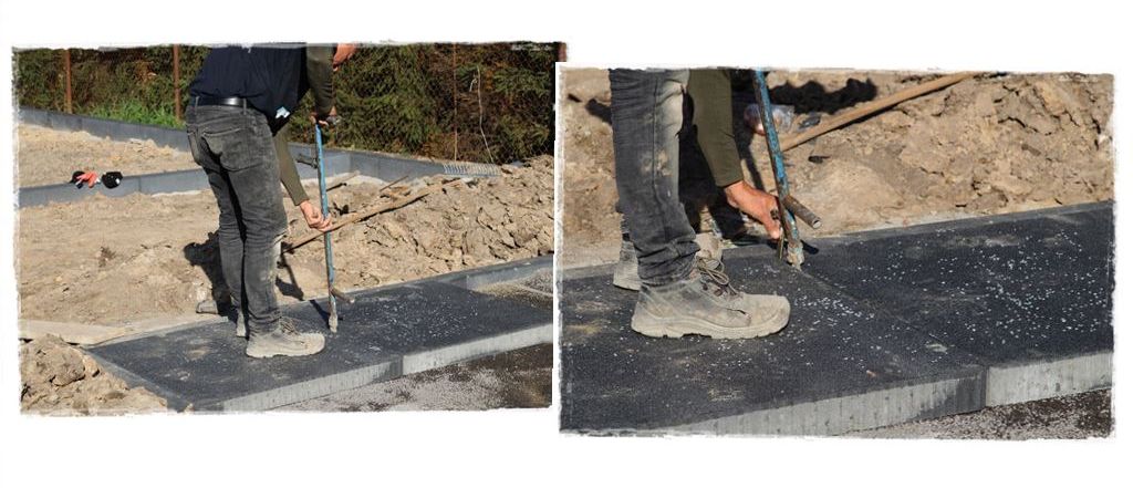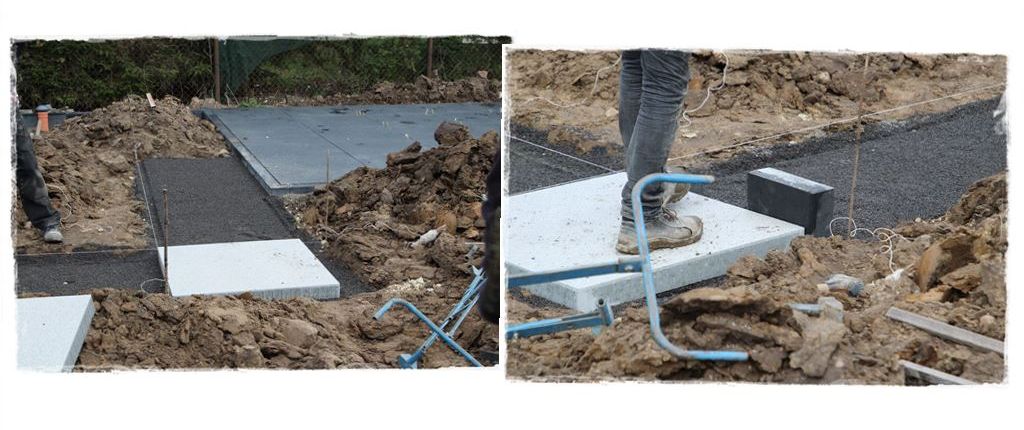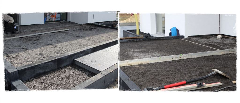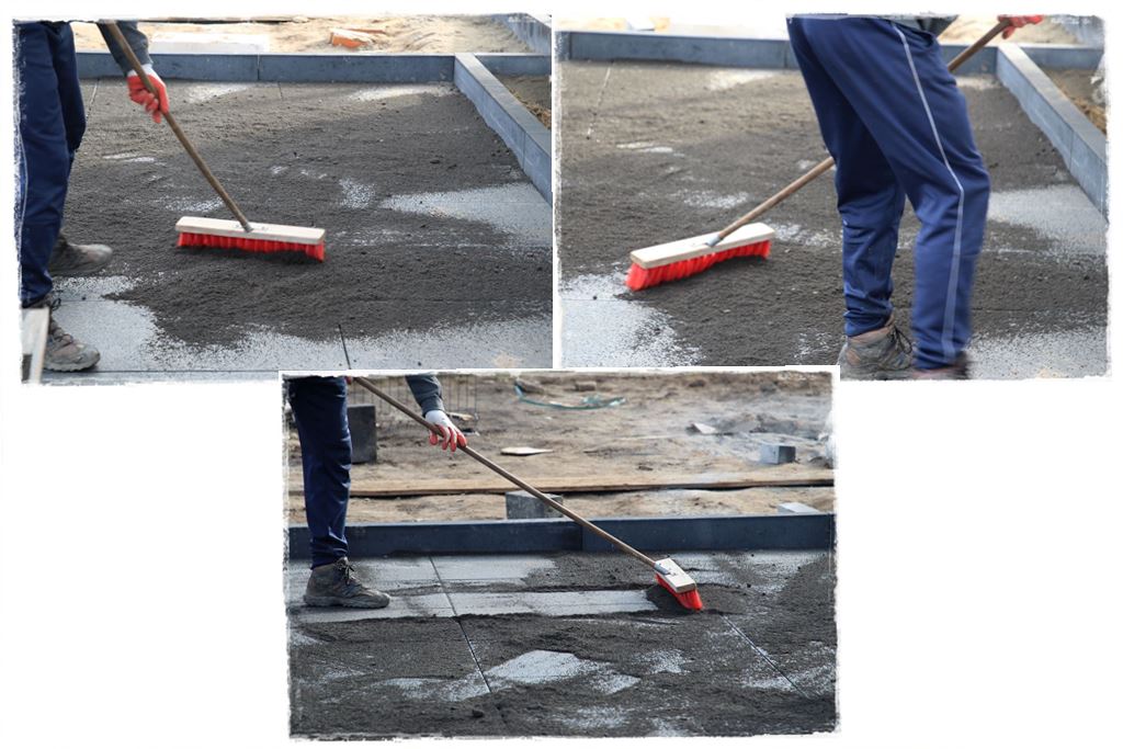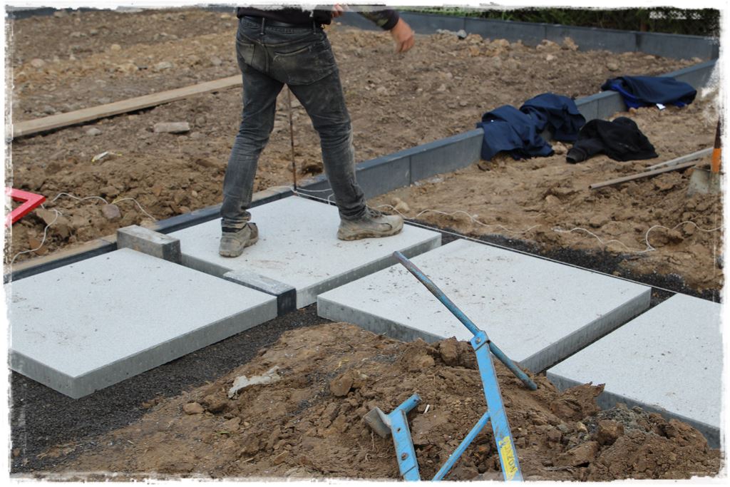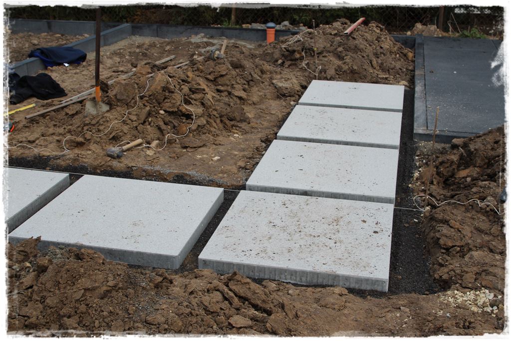 Układanie płyt również poprzedzone było wykonaniem około 4 centymetrowej podsypki z grysu o frakcji 2-8 milimetrów, którego co ważne, nie należy zagęszczać mechanicznie. Natomiast należy wyrównać go łatą, dostosowując poziom do docelowego poziomu nawierzchni.