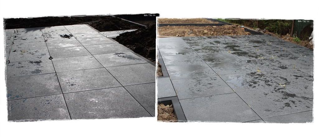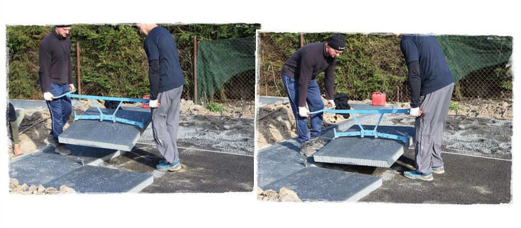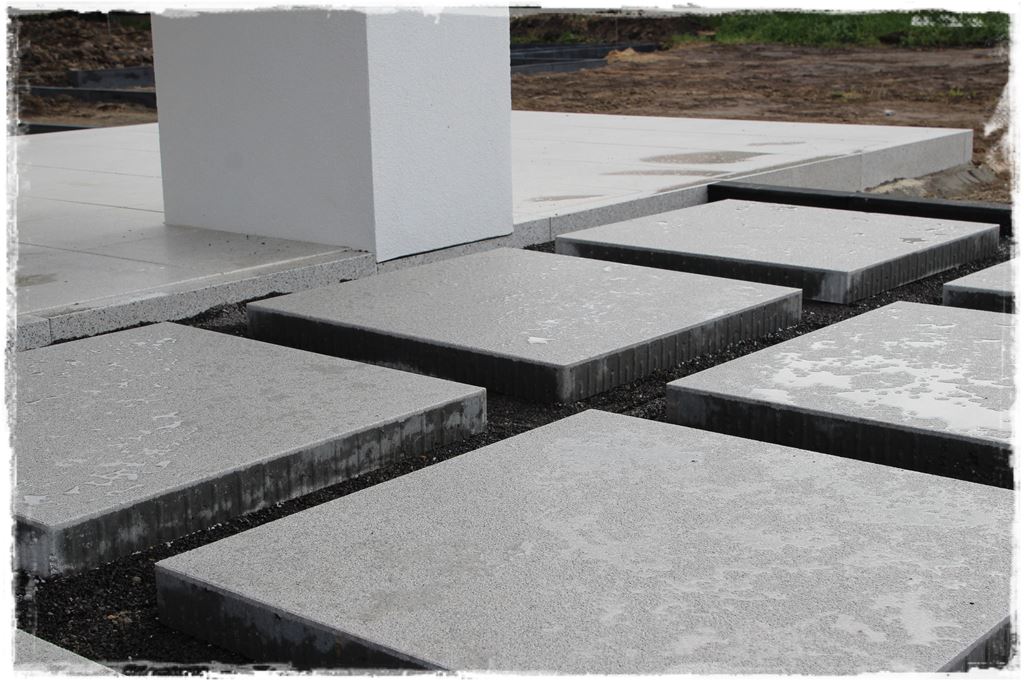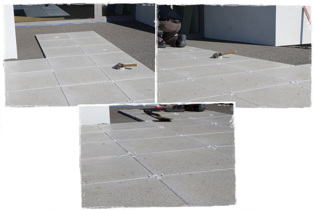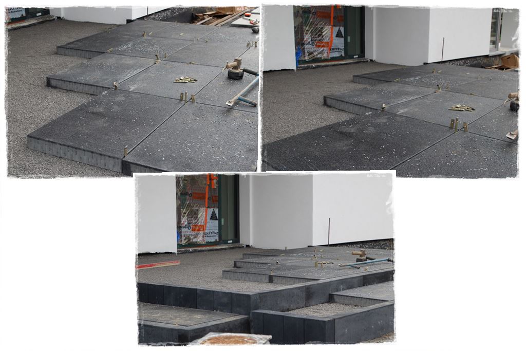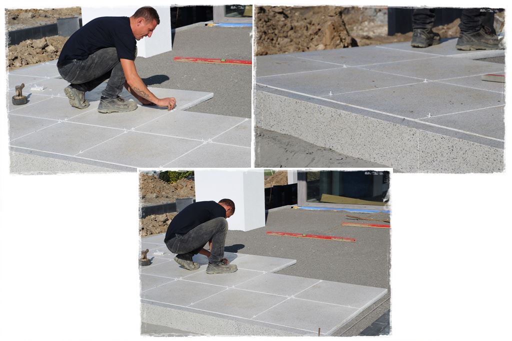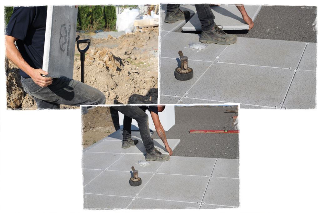 Jak w przypadku płyt wielkogabarytowych trzeba pamiętać również o fugach, które w tym przypadku powinny mieć od 3 do 10 milimetrów. Ja zdecydowałem się na 4 milimetrowe, co zachowane było z użyciem krzyżyków “do kafelkowania”. Płyty przy układaniu należy korygować młotkiem gumowym, natomiast po ułożeniu i obsypaniu (w moim przypadku pyłem piaskowym), nie należy dobijać zagęszczarką mechaniczną aby nie narazić ich na pękanie.