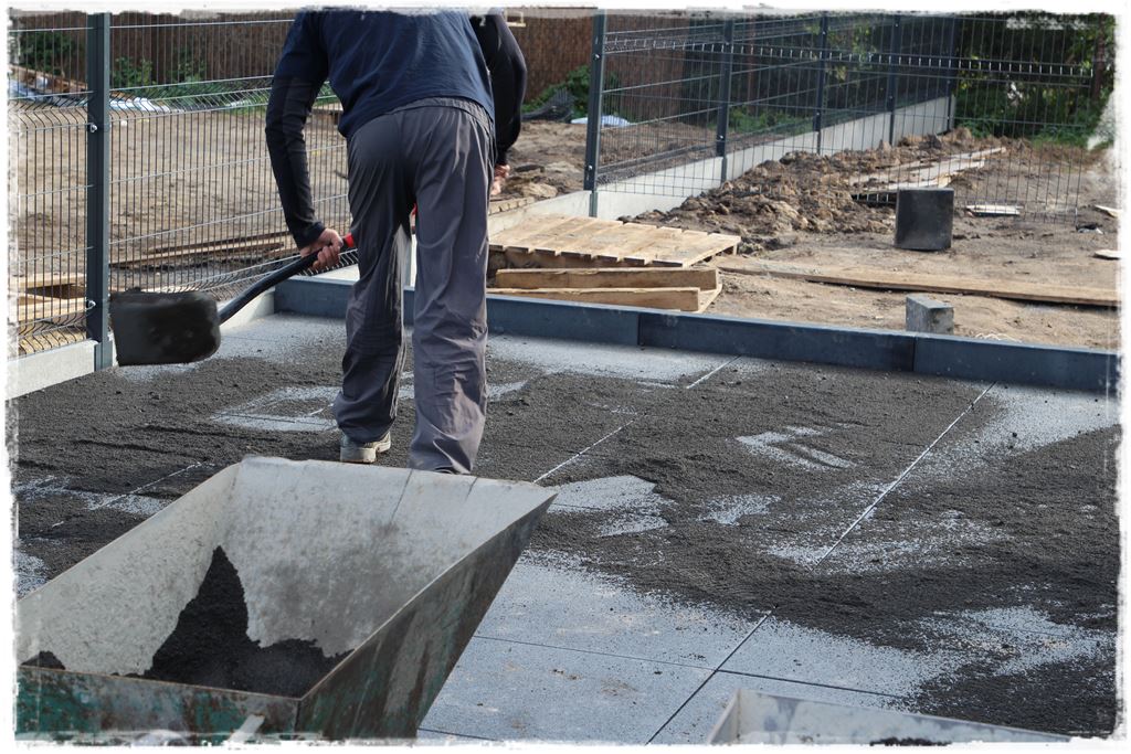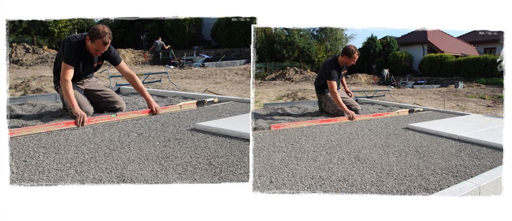 No dobrze, to już tyle tytułem wstępu, możemy zaczynać. Mając zatem wykonane podbudowy oraz ramy w postaci obrzeży i palisad, układanie płyt to w zasadzie tylko i wyłącznie wykonanie około 4 centymetrowej podsypki z grysu o frakcji 2-8 milimetrów, którą co ważne, należy zagęszczać mechanicznie. Natomiast naddatek należy zebrać i wyrównać łatą niwelacyjną, dostosowując poziom do docelowego poziomu nawierzchni. I na tak przygotowanej podsypce można układać płyty, co miało miejsce właśnie w moim przypadku.
